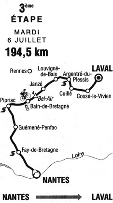 12h35 (Loire-Atlantique) : D.42 Nantes (km 0) - Orvault / Le bois Raguenet (km 0.5) - La Pâquelais (km 11.5) - D.81 Fay-de-Bretagne (km 23.5-sprint) - D.3 Plesse (km 40.5) - Guéméné-Penfao (km 51.5) - D.15 Beslé (km 60) - (Ille-et-Vilaine) : D.59 Pipriac (km 74.5-sprint) - D.777 Guipry (km 82.5) - D.772 Messac (km 85.5) - D.777 Château-Gaillard (km 97.5) - Bain-de-Bretagne (près de) (ravitaillement) - Le sel-de-Bretagne (km 104.5) - Côte de Bel-Air (km 105.5-GPM4) - Saulnières (km 107.5) - Janze (km 115.5) - Pire-Sur-Seiche (km 123.5) - Louvigne-de-Bais (km 132) - Torce (près de) (km 137.5) - D.33 Etrelles (km 144) - Argentré-du-Plessis (km 147-sprint) - D-88 Gennes-sur-Seiche (km 155.5) - (Mayenne) : D.127 Cuille (km 157.5) - Saint-Poix (km 163) - D.4 Méral (km 168) - Cosse-le-Vivien (km 173) - N.171 entrée Laval (km 188.5) - Laval / Bd. de Montmorency (km 194.5).