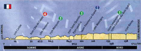 13h10 (Somme) : D1 Amiens (km 0) - Daours (km 8.5) - Aubigny (près de) (km 11) - Fouilloy (km 13) - Corbie (km 14) - Bray-sur-Somme (km 31) - Cappy (km 33.5) - Côte de Cappy (km 35-GPM4) - Herbecourt (km 40.5) - Biaches (km 45.5) - Péronne (km 47.5) - D6 Tincourt-Boucly (près de) (km 59) - Marquaix (km 60.5-sprint) - Roisel (km 62) - D24 Hervilly (km 64.5) - Montigny (km 66) - (Aisne) : D31 Jeancourt (km 68) - Le Verguier (km 69.5) - D57 Pontru (km 73) - Gricourt (près de) (km 76) - Fayet (km 78.5) - N29 Saint-Quentin (km 84.5-sprint) - D8 Lesdins (km 90.5) - Bellecour (km 93) - Méricourt (km 97) - Fresnoy-le-Grand (km 101-ravitaillement) - Bohain-en-Vermandois (km 104.5) - D28 Regnicourt (km 109.5) - Wassigny (km 116) - D272 Oisy (km 121.5) - D946 Fesmy-le-Sart (km 125) - (Nord) : La Groise (km 126.5) - Landrecies (km 135-sprint) - Fontaine-au-Bois (près de) (km 138) - Preux-au-Bois (près de) (km 139.5) - Englefontaine (km 142) - D932 Raucourt-au-Bois (près de) (km 145) - Bavay (km 158) - N49 Feignies (km 168.5) - Maubeuge / Av. Jean Jaurès (km 171.5).
