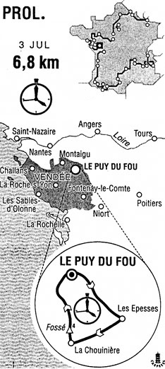 Olano a sans doute buté sur la petite (mais raide) côte au km 4.5. Au pied de la bosse, il devançait Armstrong de 3". Il terminera 3ème à 11". Tous les favoris de ce Tour sont "dans le coup" à l'issue de ce prologue.