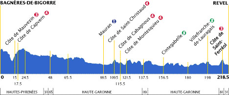 11h54 (Hautes-Pyrénées) : D938 Bagnères-de-Bigorre (km 0) - Cieutat (km 5) - Côte de Mauvezin (km 15-GPM3) - Côte de Capvern (km 17.5-GPM4) - La Barthe-de-Neste (km 24.5) - Escala (km 27) - Tuzaguet (km 30) - Anères (km 32) - D26 Nestier (km 34) - D26 Montegut (km 36) - Aventignan (km 37) - (Haute-Garonne) : D26a Saint-Bertrand de Comminges (km 44.5) - Loures-Barousse (km 48) - (Hautes-Pyrénées) : D122 Izaourt (km 47) - (Haute-Garonne) : D33B Barbazan (km 49) - D26 Garnère (km 54) - D26 Payssous (km 58.5) - Encausse-les-Thermes (km 62) - Soueich (km 65.5) - Ganties (km 70) - Léoudary (km 74.5) - Figarol (km 76.5) - D21 Mane (km 81.5) - D13 Salies-du-Salat (km 83.5) - Mazères-sur-Salat (km 87.5) - D52 Bouque-de-Lens (km 89) - D62 Roquefort-sur-Garonne (km 92) - Mauran (km 99.5-ravitaillement) - Couladère (km 104.5) - Côte de Saint-Christaud (km 109.5-GPM4) - Côte de Cabagnous (km 115.5-GPM4) - Montesquieu-Volvestre (km 118.5) - Côte de Montesquieu (km 121.5-GPM4) - Castagnac (km 134) - (Ariège) : D10 Saint-Ybars (km 137.5) - (Haute-Garonne) : D25 Gaillac-Toulza (km 147) - Cintegabelle (km 156.5-sprint) - Gardouch (km 177) - Villefranche-de-Lauragais (km 180-sprint) - Lux (km 187.5) - Revel (km 206.5) - Côte de Saint-Ferreol (km 212-GPM3) - (Tarn) : Pont-Crouzet (km 214.5) - (Haute-Garonne) : Revel /Bd. J. Jaurès (km 218.5).