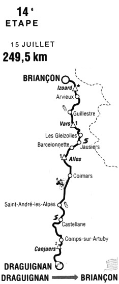 9h37 (Var) : D955 Draguignan (km 0) - Montferrat (km 11.5) - Côte de Canjuers (km 19.5-GPM2) - Comps sur Artuby (km 28) - (Alpes de Haute-Provence) : D952 Castellane (km 55.5-sprint) - Saint-André les Alpes (km 73.5-ravitaillement) - La Mure-Argens (km 78) - Thorame-Haute (km 86.5) - Beauvezer (km 99.5) - Villars-Colmars (près de) (km 102) - Colmars-les-Alpes (km 104) - Allos (km 112) - Col d'Allos (km 127-GPM1) - D902 Barcelonnette (km 145) - Jausiers (km 154-sprint) - La Condamine-Châtelard (km 160) - Les Gleizolles (km 162.5) - Saint-Paul sur Ubaye (km 169) - Col de Vars (km 177.5-GPM1) - (Haute-Alpes) : Les Claux (km 181) - Guillestre (km 197.5-ravitaillement) - D902 Arvieux (km 217) - La Casse Déserte / Stèle (km 226) - Col d'Izoard (km 228-GPM HC) - Cervières (km 237) - Serre-Chevalier 1200 (km 244.5) - Briançon / Champ de Mars (km 249.5).