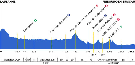 11h09 (SUISSE) - (Canton de Vaud) : N1 Lausanne (km 0) - Moudon (km 18.5) - Marnand (km 32.5) - Granses-sur-Trey (près de) (km 34.5) - (Canton de Fribourg) : Dompierre (km 45-sprint) - Domdidier (km 47.5) - (Canton de Vaud) : Avenches (km 50) - Faoug (km 54) - (Canton de Fribourg) : Greng (km 55) - N22 Galmiz (km 62.5) - Kerzers (km 66.5) - Fraschels (km 70) - (Canton de Berne) : Kallnach (km 72.5) - Bargen (km 76) - Aarberg (km 77.5) - Lyss (km 81) - Buetigen (km 86.5) - Dotzigen (km 89) - Buren-an-der-Aare (km 94.5-ravitaillement) - Ruti-bei-Buren (km 95.5) - Arch (km 97.5) - Leuzigen (km 100) - (Canton de Solothurn) : Nennigkofen (km 104) - Lusslingen - Solothurn (km 107.5) - N12 Zuchwil (km 109) - Luterbach (km 112.5) - (Canton de Berne) : N5 Attiswill (km 119) - Viedlisbach (km 119.5) - Oberbipp (km 122) - Niederbipp (km 123.5) - (Canton de Solothurn) : Oensingen (km 126) - N12 Aeussere-Klus (km 127.5) - Klus-Basthal (km 128.5) - Holderbank (km 135.5) - (Canton de Bâle) : Langenbruck (km 138) - Côte de Oberer-Hauenstein (km 139-GPM3) - Waldenburg (km 143) - Oberdorf (km 144) - Niederdorf (km 145.5) - Holstein (km 147.5) - Sad-Bubendorf (km 153.5) - Liestal (km 155.5) - B5 Côte de Fullinsdorf (km 161-GPM4) - Kaiserraugst (km 164.5) - (ALLEMAGNE) : Rheinfelden (km 171.5-ravitaillement) - Côte de Waidhof (km 180-GPM3) - Côte de Lörrach (km 187-GPM4) - Kandern (km 197) - Sitzenkirch (km 200.5-sprint) - Oberreggenen (km 204) - Feldberg (km 206.5) - Müllheim (km 211) - Seefelden (km 219.5) - Badkrozingen (km 227) - Schallstadt (km 233.5) - Wolfenweiler (km 234) - entrée Fribourg-en-Brisgau (km 237.5) - Fribourg-en-Brisgau/Parc des expositions (km 246.5).