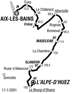 10h40 (Savoie) : Aix-les-Bains (km 0) - Grésy-sur-Aix (km 0.5) - La Verdasse (km 4.5) - Saint-Ours (km 7) - (Haute-Savoie) : Cusy (km 10.5) - (Savoie) : La Motte-en-Bauges (km 24.5) - Le Châtelard (km 26) - Sainte-Reine (km 38.5) - Col du Frêne (km 40.5-GPM4) - St-Pierre-d'Albigny (km 48) - Fréterive (km 52.5) - Grésy-sur-lsère (km 57) - Montailleur (près de) (km 59.5) - Saint-Vital (km 62) - Frontenex (km 63) - Gilly-sur-lsère (km 67) - Albertville (km 68.5-sprint) - Tours-en-Savoie (km 74.5) - La Bathie (km 77) - Cevins-en-Savoie (km 82.5) - Saint-Paul-sur-Isère (km 83) - Rognaix (km 87-ravitaillement) - Bonneval-Tareniaise (km 96.5) - La Thuile (km 102.5) - Celliers (km 103.5) - Col de la Madeleine (km 114-GPM.HC) - Saint-François-Longchamp (km 122) - Saint-Martin-la-Chambre (km 131.5) - La Chambre (km 133) - Saint-Avre (km 134) - Saint-Étienne-de-Cuines (km 135 - Le Pied-des-Voutes (km 139.5) - St-Colomban-des-Villards (km 145.5) - Col du Glandon (km 156.5-GPM.HC) - Barrage de Grand-Maison (km 163.5) - Rivier-d'Allemond (km 172) - Allemond (km 183) - Rochetaillée (km 186.5) - Le Bourg-d'Oisans (km 193-sprint) - Ribot-d'en-Bas (km 199) - Huez (km 202.5) - L'Alpe d'Huez / entrée (km 206) - L'Alpe d'Huez / Av. du Rif-Nel (km 209).