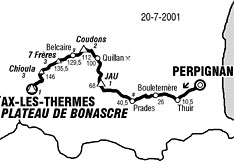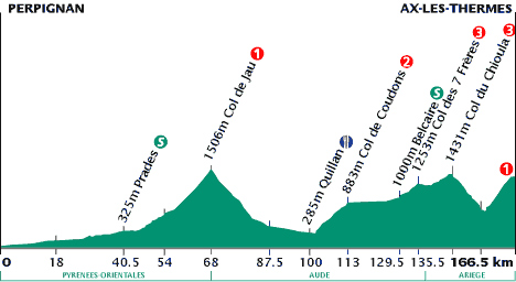 12h03 (Pyrénées-Orientales) : Perpignan (km 0) - Canohès (près de) (km 3) - Thuir (près de) (km 10.5) - Corbère-les-Cabanes (km 18) - Bouleternère (km 26) - Vinca (près de) (km 32.5) - Marquixanes (km 36) - Prades (km 40.5-sprint) - Catllar (km 45) - Molitg-les-Bains (km 49) - Mosset (km 54) - Col de Jau (km 68-GPM1) - (Aude) : Sainte-Colombe-sur-Guette (km 81) - Axat (km 87.5) - Saint-Martin-Lys (km 93.5) - Belvianes-et-Cavirac (km 97.5) - Quillan (km 100-ravitaillement) - Coudons (km 112) - Col de Coudons (km 113-GPM2) - Espezel (km 124) - . Belcaire (km 129.5) - Col des 7-Frères (km 135.5-GPM3) - Camurac (km 136) - (Ariège) : Prades (km 140) - Col du Chioula (km 146-GPM3) - Ax-les-Thermes (km 155.5) - Ax-les-Thermes / Plateau de Bonascre (km 166.5-GPM1).