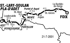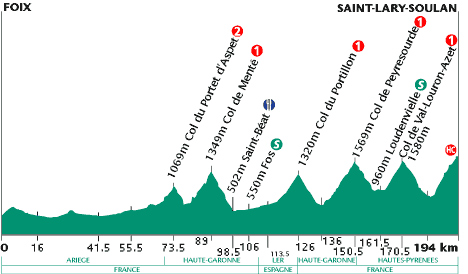 10h22 (Ariège) : Foix (km 0) - Col del Bouich (km 5.5) - Montais (près de) (km 12.5) - La Bastide-de-Serou (km 16) - Castelnau-Durban (km 24.5) - Rimont (km 30) - Lescure (km 33.5) - Saint-Girons (km 1.5) - Moulis (km 47.5) - Engomer (km 51) - Audressein (km 55.5) - Argein (km 58) - Aucazein (km 60) - lllartein (km 60.5) - Orgibet (km 62.5) - Augirein (km 65.5) - Saint-Lary (km 67.5) - (Haute-Garonne) : Portet-d'Aspet (km 71) - Col de Portet d'Aspet (km 73.5-GPM2) - Stèle Fabio Casartelli (km 77.5) - Pont de l'Oule (km 78) - Coudeloux (km 82) - Col de Menté (km 89-GPM1) - Boutx (km 95.5) - Saint-Béat (km 98.5-ravitaillement) - Arlos (km 101) - Fos (km 106-sprint) - Pont du Roi (km 108.5) - (ESPAGNE) - (Lerida) : Pontaut (km 110.5) - Les (km 113.5) - Bossost (km 117.5) - (FRANCE) - (Haute-Garonne) : Col du Portillon (km 126-GPM1) - Saint-Mamet (km 134) - Bagnères-de-Luchon (km 136) - Saint-Aventin (km 141.5) - Cazeaux-de-Larboust (km 143) - Garin (km 144) - (Hautes-Pyrénées) : Col de Peyresourde (km 150.5-GPM1) - Loudervielle (km 156) - Estarvielle (km 158) - Armenteule (km 158.5) - Loudenvielle (km 161.5-sprint) - Genos (km 163) - Col de Val-Louron-Azet (km 170.5-GPM1) - Azet (km 176) - Estensan (km 178) - Sailhan (km 179.5) - Saint-Lary-Soulan (km 181.5) - Soulan (km 188) - Saint-Lary-Soulan / Pla d'Adet (km 194-GPM.HC).