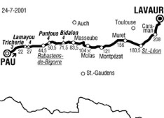 - L'US Postal assure sereinement un tempo avec 3 coureurs en tête de peloton. En effet, l'échappé le mieux classé au général est Michael Boogerd (16e à 31'18"). Alors que l'écart frôle le quart d'heure, les Kelme, leaders du classement par équipes, collaborent.