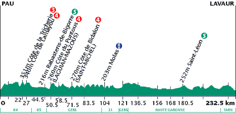 11h15 (Pyrénées-Atlantiques) : Pau (km 0) - Morlaas (km 2) - Saint-Jammes (km 8) - Gabaston (km 10) - Baleix (km 18) - Côte de La Tricherie (km 22-GPM3) - Maure (km 24.5) - Côte de Lamayou (km 27-GPM4) - Lamayou (km 28.5) - Casteide-Doat (km 30.5) - (Hautes-Pyrénées) : Vic-en- Bigorre (km 35) - Rabastens-de-Bigorre (km 44.5-sprint) - (Gers) : Villecomtal-sur-Arros (km 47.5) - Côte du Puntous (km 50.5-GPM4) - Laguian-Mazous (km 54.5) - Mielan (km 58.5) - Sainte-Dode (km 64) - Saint-Michel (km 69) - Côte de Bidalon (km 71.5-GPM4) - Saint-Elix-Theux (km 73.5) - Saint-Arroman (près de) (km 78) - Esclassan-Labastide (près de) (km 82) - Masseube (km 83.5) - Bellegarde (près de ) (km 87.5) - Meilhan (km 93) - Villefranche (km 94) - Pagatets (km 96.5) - (Haute-Garonne) : Molas (km 104-rvitaillement) - L'Isle-en-Dodon (km 107) - Frontignan-Saves (km 116.5) - (Gers) : Montpezat (km 121) - (Haute-Garonne) : Rieumes (km 136.5) - Saint-Clar-de-Riivière (km 147) - Denton (km 150) - Muret (km 156) - Labarthe-sur-Lèze (km 164) - Vernet (km 168) - Venerque (km 170) - Saint-Léon (km 180.5-sprint) - Ayguesvives (km 186) - Baziege (km 189) - Tarabel (km 200.5) - Maureville (km 203.5) - Caraman (km 208) - Vendine (km 216) - (Tarn) : Lacougotte-Cadoul (près de) (km 225.5) - Lavaur / Pl. du Foirail (km 232.5).