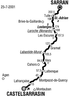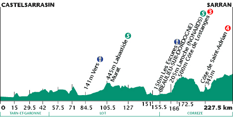 11h32 (Tarn-et-Garonne) : Castelsarrasin (km 0) - Labastide-du-Temple (km 7) - Lafrancaise (km 15) - Rouzet (km 21.5) - Molières (km 29.5) - Montpezat-de-Quercy (km 42) - (Lot) : Montdoumerc (km 50) - Lalbenque (km 57.5) - Laburgade (km 63) - Aujols (km 65.5) - Saint-Géry (km 78.5) - Vers (km 84.5) - Cours (près de) (km 93) - Saint-Martin-de-Vers (km 97) - Saint-Sauveur-la-Vallée (km 100.5) - Labastide-Murat (km 105.5) - Le Bastit (km 118.5) - Gramat (km 127) - Lavergne (km 131.5) - Saint-Jean-Lespinasse (km 144.5) - Bretenoux (km 151) - Biars-sur-Cère (km 152) - (Corrèze) : Les Escures (km 157.5-ravitaillement) - Altillac (km 160.5) - Beaulieu-sur-Dordogne (km 161.5) - Laroche (Nonards) (km 168) - Tudeils (km 171) - Côte de Lostanges (km 172.5-GPM3) - Les Quatre-Routes (Albussac) (km 182) - Sainte-Fortunade (km 191) - Quartier Montana (Laguenne) (km 197) - Tulle (km 198) - Côte de Saint-Adrian (km 202.5-GPM4) - Gimel-les-Cascades (près de) (km 210) - Étang de Ruffaud (km 212) - Gare de Corrèze (km 215.5) - Le Chêne des Bergères (km 217) - Sarran / D142 (km 229.5).