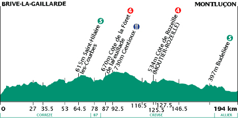 12h40 (Corrèze) : Brive-la-Gaillarde (km 0) - Malemort (km 0) - Saint-Mexant (km 15.5) - Saint-Clément (km 23) - Seilhac (km 27) - Chamboulive (km 35.5) - Le Lonzac (km 41.5) - Treignac (km 53) - Saint-Hilaire-les-Courbes (km 64.5-sprint) - Lacelle (km 70) - (Haute-Vienne) : La Villeneuve (km 76.5) - Nedde (près de) (km 78) - (Creuse) : La Villedieu (km 83.5) - Côte de la Forêt de la Feuillade (km 87-GPM4) - Faux-la-Montagne (km 88.5) - Gentioux (km 92.5-ravitaillement) - Le Chiroux (km 105.5) - Saint-Quentin-la-Chabanne (km 114) - Felletin (km 116.5) - La Clide (km 122.5) - Côte de Rozeille (km 125.5-GPM4) - Aubusson (km 127.5) - Saint-Amand (km 130.5) - La Chaussade (près de) (km 133.5) - Bosroger (près de) (km 136) - Montelladonne (km 140.5) - La Croix-de-l'Arbre (km 143.5) - Angly (km 146.5) - La Barre (km 150) - Le Chauchet (près de) (km 152) - Le Breuil-Coton (km 153) - Tardes (près de) (km 154.5) - Teillet (km 156) - Chambon-sur-Voueize (km 164.5) - Budelière (km 171.5-sprint) - (Allier) : Teillet-Argenty (km 179) - Montluçon / entrée (km 186.5) - Montluçon / av. Léon Blum (km 194).