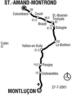 10h53 (Allier) : Montluçon (km 0) - Désertines (km 2.5) - Bel-Air (km 4) - Estivareilles (km 10) - Reugny (km 14.5) - Vallon-en-Sully (km 21.5) - Les Guèzes (km 24.5) - Le Bréthon (km 32) - Forêt domaniale de Tronçais (km 34) - Sologne (km 41.5-ravitaillement) - Saint-Bonnet-Tronçais (km 43) - Braize (km 46.5) - (Cher) : Coust (près de) (km 51.5) - Colombiers (près de) (km 56) - St-Amand-Montrond / entrée (km 59) - Saint-Amand-Montrond / Rue Pelletier-Doisy (km 61).