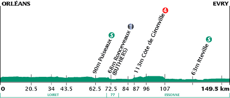 13h44 (Loiret) : Orléans (km 0) - Fleury-les-Aubrais (km 0.5) - Saint-Lye-la-Fôret (km 14) - Neuville-aux-Bois (km 20.5) - Chilleurs-aux-Bois (km 26.5) - Courcy-aux-Loges (km 34) - L'Arbre-Sec (km 35.5) - Bouilly-en-Gâtinais (km 36.5) - Courcelles (km 43.5) - Boynes (km 48) - Givraines (km 51.5) - Grangermont (km 58.5) - Puiseaux (km 62.5-sprint) - (Seine-et-Marne) : Boulancourt (km 70) - Roncevaux (km 72.5-ravitaillement) - Buthiers (km 73) - Villetard (km 75.5) - Nanteau-sur-Essonne (km 77) - (Essonne) : Buno-Bonneveaux (km 84) - Gironville-sur-Essonne (km 88) - Côte de Gironville (km 87-GPM4) - Champmotteux (km 91.5) - Mespuits (km 96) - Bois-Herpin (près de) (km 99.5) - La Fôret-Sainte-Croix (km 100.5) - La Montagne (km 104) - Étampes (km 107) - Morigny-Champigny (km 109) - Auvers-Saint-Georges (km 115.5) - Janville-sur-Juine (km 119) - Bouray-sur-Juine (km 123.5) - Itteville (km 125.5-sprint) - Ballancourt-sur-Essonne (km 128.5) - Vert-le-Petit (km 132) - Lisses (km 142.5) - Corbeil-Essonnes (près de) (km 144) - Courcouronnes (km 144.5) - Évry / entrée (km 146) - Évry / Bd. de France (km 149.5).