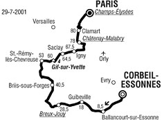 13h10 (Essonne) : Corbeil-Essonnes (km 0) - Ormoy (km 0.5) - Mennecy (km 2) - Fontenay-le-Vicomte (km 5.5) - Ballancourt-sur-Essonne (km 8.5) - Le Bouchet (km 9.5) - Saint-Vrain (km 11.5) - Marolles-en-Hurepoix (km 15) - Guibeville (km 18) - Avrainvilie (km 20) - Boissy-sous-Saint-Yon (km 23.5) - Breuillet (km 26.5) - Breux-Jouy (km 28.5-sprint) - Saint-Chéron (km 30) - Le Marais (km 34.5) - Vaugrigneuse (km 38) - Briis-sous-Forges (km 40) - Hameau de Roussigny (km 44) - Limours (km 47) - Les Molières (km 49.5) - (Yvelines) : Saint-Rémy-lès-Chevreuse (km 53) - (Essonne) : Gif-sur-Yvette (km 60-GPM4) - Saint-Aubin (km 61) - Christ-de-Saclay (km 63) - Saclay (près de) (km 64.5) - Vauhallan (km 66) - Igny (km 67.5) - Massy (km 70.5) - Verrières-le-Buisson (près de) (km 71.5) - (Hauts-de-Seine) : Antony (km 72.5) - (Essonne) : Verrières-le-Buisson (près de) (km 73.5) - (Hauts-de-Seine) : Antony (km 74.5) - Châtenay-Malabry (km 78-sprint) - Le Plessis-Robinson (km 79) - Clamart (km 80) - Issy-les-Moulineaux (km 84.5) - Boulogne-Billancourt (km 87) - (Paris) : Pont de Grenelle (km 88.5) - Entrée du circuit (km 93) - Rue de Rivoli (km 94.5) - Place de la Concorde (km 95) - 1er pass. ligne d'arrivée (km 95.5) - Haut des Champs-Élysées (km 97) - 5e pass. ligne d'arrivée (km 121.5) - 10e pass. ligne d'arrivée (km 154) - Paris / Champs-Élysées (km 160.5).