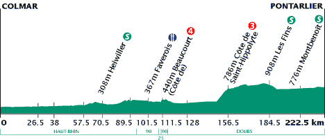 11h47 (Haut-Rhin) : Colmar (km 0) - Sundhoffen (km 3.5) - Appenwihr (km 7) - Hettenschlag (km 9.5) - Dessenheim (km 13.5) - Balgau (km 21.5) - Fessenheim (km 23) - Blodelsheim (km 26.5) - Bantzenheim (km 33) - Ottmarsheim (km 38) - Hombourg (km 41.5) - Niffer (km 47) - Kembs (km 49.5) - Sierentz (km 57.5) - Waltenheim (km 60) - Koetzingue (km 62.5) - Wahlbach (km 67) - Heiwiller (km 70.5-sprint) - Tagsdorf (km 71) - Wittersdorf (km 73) - Altkirch (km 75.5) - Carspach (km 79) - Hirtzbach (km 80.5) - Largitzen (km 86.5) - Seppois-le-Bas (km 89.5) - (Territoire-de-Belfort) : Courtelevant (km 97.5) - Faverois (km 101.5-ravitaillement) - Delle (km 103.5) - Fêche-l'Église (km 109) - (Doubs) : Badevel (km 109.5) - (Territoire-de-Belfort) : Côte de Beaucourt (km 111.5-GPM4) - (Doubs) : Dasle (km 114) - Audincourt (km 118.5) - Mandeure (km 124) - Mathay (km 128) - Bourguignon (km 132.5) - Pont-de-Roide (km 135.5) - Noirefontaine (km 140.5) - Saint-Hippolyte (km 147.5) - Côte de Saint-Hippolyte (km 156.5-GPM3) - Maiche (km 159) - Frambouhans (km 164.5) - Les Fontenelles (km 167.5) - Bonnetage (km 170) - Le Russey (km 172) - La Chenalotte (km 179.5) - Noël-Cerneux (km 181.5) - Les Fins (km 184.5-sprint) - Morteau (km 188) - Ville-du-Pont (km 204) - Montbenoît (km 206-sprint) - Maisons-du-Bois-Lièvremont (km 210.5) - Arcon (km 214) - Pontarlier / entrée (km 218.5) - Pontarlier / rue de la Libération (km 222.5).