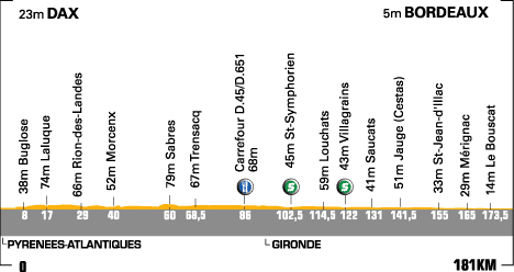 12h45 (Landes) : D129 Dax (km 0) - Saint-Vincent-de-Paul (km 4.5) - Laluque (km 17) - D27 Boos (km 21.5) - Rion-des-Landes (km 29) - Morcenx (km 38) - Morcenx (km 40) - D77 Sabres (km 60) - N134 Trensacq (km 68.5) - D45 Carr. D651 (km 86-ravitaillement) - D651 Sore (km 86.5) - (Gironde) : D220 Saint-Symphonrien (km 102.5-sprint) - D115 Louchats (km 114.5) - D219 Pussac (km 116) - Villagrains (km 122-sprint) - D651 Saucats (km 131) - D211 Jauge (km 141.5) - Pierroton (km 148) - Saint-Jean d'Illac (km 155) - D106 Beutre (km 162.5) - Mérignac (km 165) - Eysines (km 171) - Bruges (km 173) - Le Bouscat (km 173.5) - Bordeaux / Barrière du Médoc (km 177) - Bordeaux / Cours de Verdun (km 181).