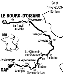 - Dans la dernière difficulté du jour, la côte de La Rochette, Parra attaque à 4 km du sommet mais Jaksche parvient à le rejoindre. Dans le dernier kilomètre d'ascension, Vinokourov porte une violente accélération. Armstrong n'a plus qu'Heras avec lui et doit s'employer. "Vino" fait le trou, dépose Jaksche et Parra et passe la côte (km 176.5) en tête. Dans la descente vers Gap, sur une route rendue glissante avec le goudron fondu, Beloki fait une chute violente (plusieurs fractures dont le fémur) et Armstrong, pour l'éviter, coupe par un champ qu'il traverse. Beloki est hospitalisé.
