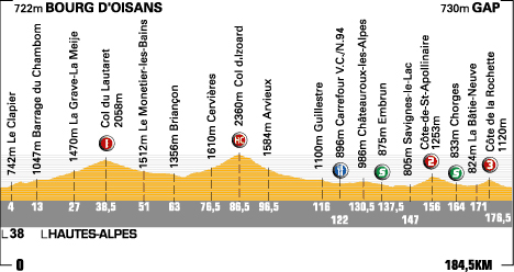 11h48 (Isère) : N91 Le Bourg d'Oisans (km 0) - Le Ferney-d'Oisans (km 10) - Barrage du Chambon (km 13) - (Hautes-Alpes) : La Grave-la-Meije (km 27) - Col du Lautaret (km 38.5-GPM 1) - Le Monêtier-les-Bains (km 51) - La Salle-les-Alpes (km 58) - Chantemerle-Serre-Chevalier (km 59.5) - Briançon (km 63) - D902 Fontchristianne (km 69) - Cervières (km 76.5) - Le Laus (km 78.5) - Col d'Izoard (km 86.5-GPM1) - Stèle Bobet/Coppi (km 88.5) - Arvieux (km 96.5) - Guillestre (km 116) - Carr. VC/N94 (km 122-ravitaillement) - N94 Saint-Clément-sur-Durance (km 124) - D994h Châteauroux-les-Alpes (km 130.5) - N94 Embrun (km 137.5-sprint) - Savines-le-Lac (km 147) - Lac de Serre-Ponçon (km 148) - D541 Saint-Apollinaire (côte de) (km 156-GPM2) - D9 Chorges (km 164-sprint) - La-Bâtie-Neuve (km 171) - D14 La Rochette (km 176) - Côte de La Rochette (km 176.5) - D314 Pont-Sarrazin (km 180.5) - N94 Gap / entrée (km 182.5) - Gap (km 184.5).
