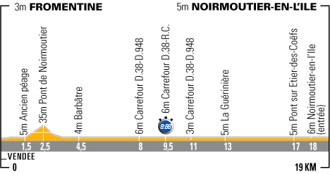 15h40 à 18h48 (Vendée) : D38 Fromentine (km 0) - Pont de Noirmoutier (km 2.5) - Barbâtre (km 4.5) - D38 Carr. RC (km 9.5-chrono) - La Guérinière (km 13) - D38 Carr. D948 (km 15) - D948 Noirmoutier-en-l'Île (km 18) - Noirmoutier-en-l'Île / Av. de Padron (km 19).