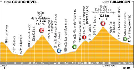 12h20 (Savoie) : D98 Courchevel (km 0) - Méribel-village (km 3.5) - Le Raffort (km 4.5) - Les Allues (km 8) - D915 Salins-les-Thermes (km 18.5) - Moûtiers (km 19) - N90 Aigueblanche (km 22.5) - D97 La Lechère (km 26) - D213 Villard-Soffray (km 37.5) - La Thulle (km 43.5) - Celliers (km 44.5) - Col de la Madeleine (km 55.GPM.HC) - Saint-François-Longchamps (km 63) - Le Planet (km 65) - Saint-Martin-sur-la-Chambre (km 72) - La Chambre (km 74) - N6 Saint-Avre (km 78-ravitaillement) - N85.5 Saint-Jean-de-Maurienne (km 85.5) - Saint-Julien-Mont-Denis (km 89.5) - Saint-Michel-de-Maurienne (km 97.5-sprint) - D902 Saint-Martin d'Arc (km 98) - Col du Télégraphe (km 110-GPM1) - Les Granges (km 113) - Les Choseaux (km 113.5) - Valloire (km 114.5) - Les Verneys (km 117) - La Rivine (km 118.5) - Plan-Lachat (km 124.5) - Col du Galibier (km 133-GPM.HC) - (Hautes-Alpes) : Col du Lautaret (km 142) - N91 Le Pont-de-l'Alp (km 149) - Le Monêtier-les-Bains (km 155) - Villeneuve-la-Salle (km 160) - Moulin-Baron (km 162-sprint) - Chantemerle (km 163) - Saint-Chaffrey (km 165.5) - D36a Briançon / Rue De Lattre de Tassigny (km 173).