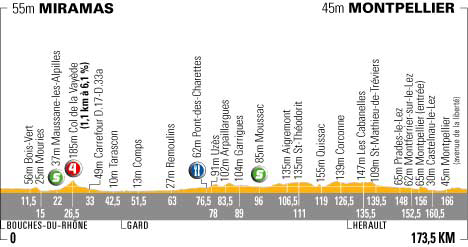 13h30 (Bouches-du-Rhône) : D10 Miramas (km 0) - Bois-Vert (km 11.5) - D17 Mouriès (km 15) - Maussane-les-Alpilles (km 22-sprint) - D27a Les-Baux-de-Provence (km 26) - Col de la Vayède (km 26.5-GPM4) - D14 Carr. D33a (km 33) - D970 Tarascon (km 42.5) - (Gard) : D999 Beaucaire (km 45) - D986i Comps (km 51.5) - Montfrin (km 54.5) - Meynes (km 56.5) - Remoulins (km 63) - D19 La Bégude (km 66) - D981 Pont des Charrettes (km 76.5-ravitaillement) - Uzès (km 78) - D982 Arpaillargues-et-Aureillac (km 83.5) - Moussac (km 96-sprint) - N106 La Réglisserie (km 98.5) - Brignon (km 98.5) - Nozières (km 100) - Domessargues (km 102.5) - Aigremont (km 106.5) - D27 Saint-Théodorit (km 111) - Quissac (km 118) - D45 Corconne (km 126.5) - (Hérault) : D17 Les Rives (km 131) - Les Cabanelles (km 135.5) - Valflaunès (km 136) - Saint-Mathieu-de-Tréviers (km 139.5) - Le Triadou (km 143.5) - Prades-le-Lez (km 148) - D112 Saint-Clément-de-Rivière (km 150.5) - Montferrier-sur-le-Lez (km 152.5) - D17e Montpellier / entrée (km 156) - Castelnau-le-Lez (km 160.5) - Montpellier / Av. de Heidelberg (km 173.5).