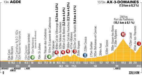 10h51 (Hérault) : D912 Agde (km 0) - Vias (km 3) - Cers (km 13) - Villeneuve-lès-Béziers (km 14.5) - Béziers (km 18.5) - Nissan-les-Enserune (km 31) - (Aude) : N113 Narbonne (km 50-sprint) - Montredon-des-Corbières (km 54) - Saint-André-de-Roquelongue (km 66.5) - Thézan-des-Corbières (km 71.5) - D613 Saint-Laurent-de-Cabrerisse (km 78-sprint) - Talairan (km 84) - Col de Villerouge (km 90.5-GPM4) - Col de Bedos (km 98.5-GPM4) - Laroque-de-Fa (km 101) - Col des Fourches (km 104-GPM4) - Monthoumet (km 104.5) - Col du Paradis (km 115.5-GPM3) - Arques (km 121.5) - Serres (km 126.5) - Coustaussa (km 130.5) - Couiza (km 132.5-ravitaillement) - D118 Espéraza (km 136) - Quillan (km 142.5) - D117 Belviannes-et-Cavirac (km 148) - D118 Axat (km 157) - Gesse (km 167) - Usson-les-Bains (km 176) - (Ariège) : D116 Mijanès (km 181) - D25 Station de Mijanès (km 185.5) - Port de Pailhères (km 191.5-GPM.HC) - Lavail (km 203) - Ascou (km 205.5) - D613 Ax-les-Thermes (km 210) - D820 Bonascre (km 218) - Ax-3-Domaines / Rue des Chalets (km 220.5).