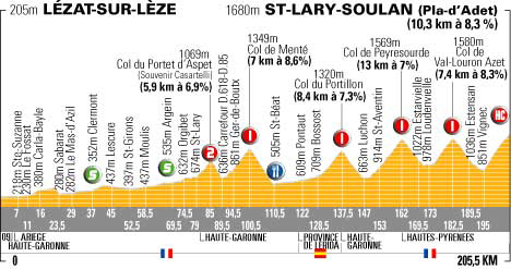 11h12 (Ariège) : D919 Lézat-sur-Lèze (km 0) - Le Fossat (km 11) - D14 Carla-Bayle (km 16) - Sabarat (km 23.5) - Le Mas-d'Azil (km 29) - Clermont (km 37-sprint) - Lescure (km 45) - D117 Saint-Girons (km 52.5) - D618 Moulis (km 58.5) - Argein (km 69.5-sprint) - Saint-Lary (km 79) - (Haute-Garonne) : Col de Portet d'Aspet (km 85-GPM2) - D44 Ger-de-Bouxt (km 94.5) - Col de Menté (km 100.5-GPM1) - Saint-Béat (km 110.5-ravitaillement) - N125 Arlos (km 112.5) - (ESPAGNE) - N230 Pontaut (km 122) - Bossost (km 128.5) - (FRANCE) - (Haute-Garonne) : D618 Col du Portillon (km 137.5-GPM1) - Saint-Mamet (km 145.5) - D618a Bagnères-de-Luchon (km 147) - Cazeaux-de-Larboust (km 154.5) - (Hautes-Pyrénées) : Col de Peyresourde (km 162-GPM1) - D25 Estarvielle (km 169.5) - Loudenvielle (km 173) - Genos (km 174.5) - D225 Col de Val-Louron-Azet (km 182.5-GPM1) - Azet (km 187.5) - D25 Sailhan (km 191) - D929 Saint-Lary-Soulan (km 193.5) - D123 Vignec (km 195) - Soulan (km 200) - Saint-Lary-Soulan - Pla d'Adet / Rue du Pont-Bieilh (km 205.5).