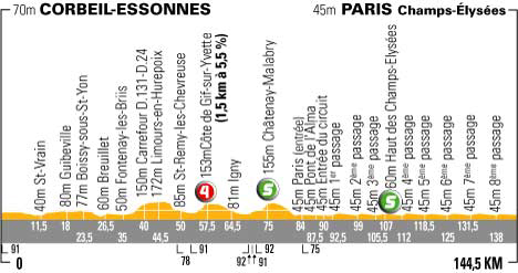 13h40 (Essonne) : N191 Corbeil-Essonne (km 0) - Fontenay-le-Vicomte (km 5.5) - D17 Ballancourt-sur-Essonne (km 9) - Saint-Vrain (km 11.5) - D8 Marolles-en-Hurepoix (km 15) - D26 Guibeville (km 18) - Boissy-sous-Saint-Yon (km 23.5) - Breuillet (km 26.5) - D82 Bruyères-le-Châtel (km 28) - D97 Fontenay-lès-Briis (km 35) - Briis-sous-Forges (km 37.5) - D24 Roussigny (km 41) - D838 Les Molières (km 46.5) - (Yvelines) : D938 Saint-Rémy-les-Chevreuses (km 50) - (Essonne) : D906 Gif-sur-Yvette (km 57) - Côte de Gif-sur-Yvette (km 58-GPM4) - N86 Saint-Aubin (km 58.5) - D36 Saclay (km 61.5) - D60 Vauhallan (km 63) - Verrières-le-Buisson (km 68.5) - (Hauts-de-Seine) : D128 Antony (km 71.5) - Châtenay-Malabry (km 75-sprint) - D2 Le-Plessis-Robinson (km 76) - Issy-les-Moulineaux (km 81.5) - D50 Boulogne-Billancourt (km 84) - (Paris) : 1er passage ligne (km 92.5) - 2ème (km 99) - 3ème (km 105.5) - hauts des Champs-Élysées (km 107-sprint) - 4ème (km 112) - 5ème (km 118.5) - 6ème (km 125) - 7ème (km 131.5) - 8ème 138) - Paris / Champs-Élysées (km 144.5).