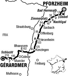 (km 27-GPM3) - Gernsbach (km 33.5) - L78 Côte de Nachtigal (km 38.5-GPM3) - L500 Côte de Zimmerplatz (km 48-GPM3) - K3753 Bühlertal (km 52.5) - Altschweier (km 54.5) - K3764 Bühl (km 56.5) - Sasbach (km 64.5-sprint) - Achern (km 65.5) - Renchen (km 73) - Appenweier (km 78) - Offenburg (km 86.5) - Niederschoffheim (km 97.5) - Friesenheim (km 103-ravitaillement) - Lahr-Schwarzwald (km 106.5) - Herbolzheim (km 121.5) - Kenzingen (km 125.5-sprint) - L113 Riegel (km 132) - K5144 Sasbach (km 132) - (FRANCE) - (Bas-Rhin) : D10 Markholsheim (km 152.5) - Elsenheim (km 156) - (Haut-Rhin) : Illhaeusern (km 162-sprint) - Guémar (km 164.5) - Ribeauvillé (km 170) - D1bis Zellenberg (km 173.5) - Ingersheim (km 182.5) - D10 Turkheim (km 185.5) - Munster (km 196.5) - D417 Stosswihr (km 200) - Soultzeren (km 202) - (Vosges) : Col de la Schlucht (km 216-GPM2) - Le Collet (km 218) - La Roche du Diable (km 221) - Xonrupt-Longemer (km 225.5) - Gérardmer / Bd. d'Alsace (km 231.5).