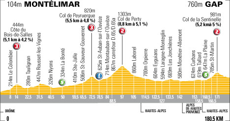 ![]() dimanche 16 juillet 2006 ![]() 13h00 (Drôme) : D4 Montélimar (km 0) - Espeluche (km 4.5) - Le Colombier (km 8) - D4 Carr. D24 (km 9) - D24 Côte du Bois de Salles (km 14-GPM3) - Salles-sous-Bois (km 19) - Taulignan (km 22.5) - Rousset-les-Vignes (km 31.5) - Nyons (km 40.5) - D94 Aubres (km 45) - La Bonté (km 50-sprint) - Pont de Curnier (km 53) - D64 Sainte-Jalle (km 59.5) - Saint-Sauveur-Gouvenet (près de) (km 65.5) - La Bâtie-Verdun (près de) (km 70) - Col de Peyruergue (km 72.5-GPM3) - D64 Carr. D546 (km 77) - D546 Saint-Auban-sur-l'Ouvèze (km 78.5-ravitaillement) - Montauban-sur-l'Ouvèze (km 84) - Col de Perty (km 97-GPM2) - Laborel (km 105) - (Hautes-Alpes) : Orpierre (km 114.5) - D30 Carr. D949 (km 121.5) - Eyguians (km 122.5) - Laragne-Montéglin (km 147) - D942 Lazer (km 132) - D12 Monêtier-Allemont (km 142) - (Alpes-de-Haute-Provence) : D12 Carr. D4 (km 143.5) - (Hautes-Alpes) : D46 Tallard (km 158.5) - D942 Lettret (km 159.5) - La Plaine (km 160.5-sprint) - D942 Carr. D900b (km 162) - D942a Jarjailles (km 169.5) - Col de la Sentinelle (km 171-GPM2) - Gap / entrée (km 178) - Gap / Av. du Maréchal Foch (km 180.5). ![]() ![]() ![]() 160 partants. Météo : beau temps sur toute l'étape. - Après de multiples attaques, un premier groupe se détache comprenant Hincapie, Mazzoleni, Goubert, Ballan, Commesso, Valjavec, Camano, Arroyo & Rujano. Le peloton est sur le point de se reformer mais au km 25, Commesso remets ça et il part seul. Il est rejoint successivement par Hincapie, Mazzoleni & Camano. Au km 31, Fedrigo revient à son tour. Le peloton ne laisse pas faire et c'est un nouveau regroupement au km 33. - Pourtant Kessler, Fedrigo et Commesso (qui mérite bien le prix de la combativité !) repartent puis huit contre-attaquants les rejoignent : Martinez, Sastre, Moreau, Leipheimer, Aerts, Vila, Karpets & Zubeldia soit 11 hommes devant. A nouveau le peloton réagit au km 35. Seuls Martinez, Kessler, Fedrigo, Commesso et Aerts peuvent se maintenir à l'avant. Ils prennent difficilement une trentaine de secondes d'avance et luttent jusqu'au km 65 où le peloton se décide enfin à relâcher la pression. - De nombreux coureurs se lancent alors à leur poursuite mais seuls Verbrugghe et Canada font la jonction au km 70. Cette partie de manivelles provoque le lâchage de Martinez et on retrouve donc un groupe de 6 en tête. Au ravitaillement de St-Auban (km 78.5), les échappés passent avec 3'35" d'avance, écart qui montera à 5'35" au maximum. A une quarantaine de kilomètres du but, deux chutes consécutives dans le même virage mettent à terre Verbrugghe, Canada et Kessler. Les deux premiers seront contraints à l'abandon. Seuls Fedrigo, Aerts et Commesso restent devant. - Au pied du col de la Sentinelle (km 163), les fuyards possèdent encore 1'50" sur le peloton. Fedrigo attaque dans le col et condamne Aerts mais Commesso parvient à suivre. Ils franchissent le col (km 171) en tête avec 33" d'avance sur Boogerd qui anime le peloton : il reste 19 kilomètres avant Gap. Aux 5000 mètres, le duo précède la meute (très réduite après le col) de 20". Ils résistent et Commesso prend les choses en main après la flamme rouge mais Fedrigo, le plus frais, le déborde et s'impose. Très belle étape. Oscar Pereiro conserve son maillot jaune. ![]() Étape : ![]() 1. Pierrick Fedrigo (Fra) en 4h14'23" (moy : 42.574 km/h) 2. Salvatore Commesso (Ita) 3. Christian Vandevelde (Usa) à 3" 4. Christophe Moreau (Fra) à 7" 5. Georg Totschnig (Aut) 6. Stefano Garzelli (Ita) 7. Michael Boogerd (Hol) 8. Cristian Moreni (Ita) 9. George Hincapie (Usa) 10. Cadel Evans (Aus) 11. Alexandre Botcharov (Rus) 12. Christophe Rinero (Fra) 13. Damiano Cunego (Ita) 14. Cyril Dessel (Fra) 15. Denis Menchov (Rus) 16. Haimar Zubeldia (Esp) 17. Markus Fothen (All) 18. Fränk Schleck (Lux) 19. Carlos Sastre (Esp) 20. Marzio Bruseghin (Ita) 21. Andreas Klöden (All) 22. Tadej Valjavec (Slo) 23. Axel Merckx (Bel) 24. Patrik Sinkewitz (All) 25. Michael Rogers (Aus) 26. Benoît Salmon (Fra) 27. Oscar Pereiro (Esp) 28. Vladimir Karpets (Rus) 29. José Azevedo (Por) 30. David Arroyo (Esp) 32. Levi Leipheimer (Usa) 33. Juan Miguel Mercado (Esp) 34. Yaroslav Popovych (Ukr) 35. Pietro Caucchioli (Ita) 36. Christophe Brandt (Bel) 37. Moises Dueñas (Esp) à 29" 38. José Luis Arrieta (Esp) à 41" 39. Ruben Lobato (Esp) 40. Ivan Ramiro Parra (Col) 41. Sylvain Calzati (Fra) 42. Iker Camaño (Esp) à 50" 43. David Lopez Garcia (Esp) à 58" 44. Matthieu Sprick (Fra) à 1'58" 45. José Angel Gomez Marchante (Esp) à 2'04" 46. Francisco José Ventoso (Esp) 47. Miguel Angel Martin Perdiguero (Esp) 48. Sylvain Chavanel (Fra) à 2'18" 49. Anthony Geslin (Fra) 50. Marco Velo (Ita) 51. Filippo Pozzato (Ita) 52. Iñaki Isasi (Esp) 53. Francisco Javier "Patxi" Vila (Esp) 54. Carlos Da Cruz (Fra) 55. Mikel Astarloza (Esp) 56. Laurent Lefèvre (Fra) 57. Sébastien Hinault (Fra) 58. Serhiy Honchar (Ukr) 59. Iñigo Landaluze (Esp) 60. Michael Rasmussen (Dan) à 3'49" 61. Thomas Lövkvist (Sue) à 5'18" 62. Cédric Vasseur (Fra) 63. Koos Moerenhout (Hol) 64. Mario Aerts (Bel) 65. David De La Fuente (Esp) 66. Xabier Zandio (Esp) à 6'28" 67. Patrice Halgand (Fra) à 6'58" 68. Stuart O'Grady (Aus) 69. Matteo Tosatto (Ita) 70. Pieter Weening (Hol) 71. Alexandre Moos (Sui) à 7'44" 72. Robbie McEwen (Aus) à 8'04" 73. Erik Zabel (All) 74. Björn Schröder (All) 75. Sebastian Lang (All) 76. Ralf Grabsch (All) 77. Juan Antonio Flecha (Esp) 78. Bernhard Eisel (Aut) 79. Jens Voigt (All) 80. Maxim Iglinskiy (Kaz) 81. Manuel Calvente (Esp) 82. Viatcheslav Ekimov (Rus) 83. Gustav-Erik Larsson (Sue) 84. Pavel Padrnos (Tch) 85. Simon Gerrans (Aus) 86. Jérôme Pineau (Fra) 87. Didier Rous (Fra) 88. Unai Etxebarria (Ven) 89. Egoi Martinez (Esp) 90. Oscar Freire (Esp) 91. Giuseppe Guerini (Ita) 92. Fabian Wegmann (All) 93. Joost Posthuma (Hol) 94. José Luis Rubiera (Esp) 95. Tom Boonen (Bel) 96. Johan Van Summeren (Bel) 97. Arnaud Coy