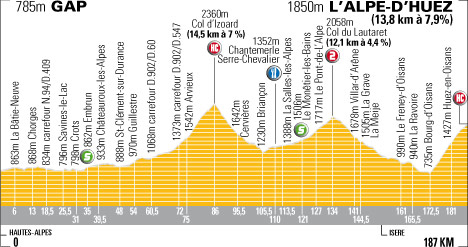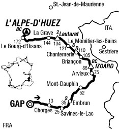 ![]() mardi 18 juillet 2006 ![]() 11h30 (Hautes-Alpes) : Gap (km 0) - La Bâtie-Neuve (km 6) - Chorges (km 13) - N94 Carr. D409 (km 18.5) - Savines-le-Lac (km 25.5) - Crots (km 31) - Embrun (km 35-sprint) - Châteauroux-les-Alpes (km 39.5) - Saint-Clément-sur-Durance (km 48) - Guillestre (km 54) - D902 Carr. D60 (km 60.5) - D902 Carr. D547 (km 72) - Arveix (km 75) - Col d'Izoard (Fra-GPM.HC) - Cervières (km 95.5) - Briançon (km 105.5) - Chantemerle (km 110-ravitaillement) - La-Salles-les-Alpes (km 113.5) - Le-Monêtier-les-Bains (km 121-sprint) - Le Pont-de-l'Alpe (km 127) - Col du Lautaret (km 134-GPM2) - Villar-d'Arène (km 141) - La Grave (km 144.5) - (Isère) : Le-Freynet-d'Oisans (km 161) - La Ravoire (km 165.5) - Bopurg-d'Oisans (km 172.5) - Huez-en-Oisans (km 181) - L'Alpe-d'Huez (km 187). ![]() ![]() ![]() 156 partants. Météo : beau temps puis quelques orages à partir du Lautaret. - Comme pratiquement tous les jours, de nombreuses attaques secouent le peloton dès le départ mais il faut attendre le km 32 pour voir un groupe de 25 coureurs prendre le large : Hincapie, Martinez, Schleck, Voigt, Zabriskie, Mazzoleni, Arrieta, Wegmann, Flecha, Merckx, Cunego, Vila, Arroyo, Garcia Acosta, Charteau, Landaluze, Chavanel, De la Fuente, Eisel, Vaugrenard, Albasini, Garzelli, Pineau & Knees. Au sprint d'Embrun (km 35) gagné par Eisel, l'écart est de 1'30" et il monte à 4' au km 60 peu avant l'ascension de l'Izoard. - Au pied du col, l'écart est passé à 4'45". Dans l'acension de 14 kilomètres, Garzelli s'isole et franchit le col en premier, à 1'12" De la Fuente et Cunego. Le reste du groupe est essaimé. Dans la descente les échappés de regroupent plus ou moins, Garzelli est repris au km 115 et 18 coureurs sont alors en tête, un groupe de 9 poursuivants est à 3' et le peloton à 5'. - De la Fuente et Vila s'échappent dans l'ascension du Lautaret et ils passent le sommet dans cet ordre, à 25" Garzelli menant le reste du groupe, à 4'17" le peloton qui est encore assez fourni. De la Fuente et Vila se relèvent dans la descente, le but ayant été pour De la Fuente de consolider son maillot à pois. Désormais 15 coureurs roulent en tête. Au km 172, ils ne sont plus que 14 avec 3'40" d'avance sur le peloton tandis que derrière, l'équipe Phonak a pris les choses en main. Au pied de l'Alpe d'Huez, l'écart est de 3'20". - Dans l'ascension finale, Cunego, Schleck et Mazzoleni se détachent alors qu'à l'arrière ce sont Landis, Evans et Klöden qui accélèrent et provoquent la sélection. A 12 kilomètres de la ligne, il ne reste plus en tête que Cunego et Schleck et aux 5000 mètres, ils possèdent encore 1'40" sur le duo Landis / Klöden mais Schleck place un démarrage et décroche Cunego. Il remporte l'étape en solitaire avec 11" d'avance sur Cunego. Garzelli, "rescapé" de l'échappée matinale, termine en compagnie de Landis et Klöden à 1'10". Le peloton arrive en ordre dispersé, les écarts sont importants. Floyd Landis reprend le maillot jaune à Pereiro qui s'est bien défendu en terminant à 2'49" du vainqueur et reste 2ème au C.G. à 10" seulement de l'Américain. ![]() Étape : ![]() 1. Fränk Schleck (Lux) en 4h52'22" (moy : 38.376 km/h) 2. Damiano Cunego (Ita) à 11" 3. Stefano Garzelli (Ita) à 1'10" 5. Andreas Klöden (All) 6. Ruben Lobato (Esp) à 1'14" 7. Sylvain Chavanel (Fra) à 1'18" 8. Eddy Mazzoleni (Ita) à 1'28" 9. Carlos Sastre (Esp) à 1'35" 10. Levi Leipheimer (Usa) à 1'49" 11. Denis Menchov (Rus) à 2'21" 12. Michael Rasmussen (Dan) 13. Pietro Caucchioli (Ita) 14. Oscar Pereiro (Esp) à 2'49" 15. Michael Rogers (Aus) 16. Cadel Evans (Aus) 17. Ivan Ramiro Parra (Col) 18. Axel Merckx (Bel) à 2'56" 19. Cyril Dessel (Fra) à 3'04" 20. Haimar Zubeldia (Esp) 21. Mikel Astarloza (Esp) à 3'07" 22. David Arroyo (Esp) à 3'18" 23. Gilberto Simoni (Ita) à 3'24" 24. David De La Fuente (Esp) à 3'36" 25. Christophe Moreau (Fra) à 3'48" 26. Tadej Valjavec (Slo) 27. José Luis Arrieta (Esp) à 4'11" 28. Iñigo Landaluze (Esp) à 4'31" 29. Yaroslav Popovych (Ukr) 30. George Hincapie (Usa) 31. Michael Boogerd (Hol) 32. Marzio Bruseghin (Ita) à 5'15" 33. Vladimir Karpets (Rus) à 5'16" 34. Georg Totschnig (Aut) 35. Xabier Zandio (Esp) 36. Laurent Lefèvre (Fra) 37. Markus Fothen (All) 38. Stéphane Goubert (Fra) 39. Iker Camaño (Esp) 40. Christophe Brandt (Bel) 41. Juan Miguel Mercado (Esp) 42. Christian Vandevelde (Usa) 43. Koos Moerenhout (Hol) 44. Benoît Salmon (Fra) à 6'30" 45. David Moncoutié (Fra) 46. Francisco Javier "Patxi" Vila (Esp) à 7'08" 47. Moises Dueñas (Esp) à 7'15" 48. José Azevedo (Por) 49. Giuseppe Guerini (Ita) 50. Alexandre Botcharov (Rus) à 7'50" 51. Christophe Rinero (Fra) 52. Sébastien Joly (Fra) à 7'51" 53. José Angel Gomez Marchante (Esp) à 8'34" 54. Thomas Lövkvist (Sue) à 8'39" 55. David Millar (Gbr) à 9'06" 56. Björn Schröder (All) 57. Alexandre Moos (Sui) à 10'10" 58. Sylvain Calzati (Fra) à 10'52" 59. Riccardo Ricco (Ita) à 10'53" 60. Christopher Horner (Usa) à 11'34" 61. Patrice Halgand (Fra) à 11'52" 62. Patrik Sinkewitz (All) à 12'20" 63. Bram Tankink (Hol) à 12'26" 64. Jens Voigt (All) à 13'52" 65. Sebastian Lang (All) à 14'11" 66. Pavel Padrnos (Tch) à 15'56" 67. Sandy Casar (Fra) 68. Pierrick Fedrigo (Fra) 69. Juan Manuel Garate (Esp) 70. Viatcheslav Ekimov (Rus) 71. Egoi Martinez (Esp) 72. Johan Van Summeren (Bel) 73. Gorka Verdugo (Esp) 74. Samuel Dumoulin (Fra) 75. Manuel Calvente (Esp) 76. Iñaki Isasi (Esp) 77. Matej Mugerli (Slo) à 17'28" 78. Didier Rous (Fra) 79. Anthony Geslin (Fra) 80. Anthony Charteau (Fra) 81. Matthias Kessler (All) à 18'28" 82. Fabian Wegmann (All) 83. Maxim Iglinskiy (Kaz) à 19'22" 84. Serhiy Honchar (Ukr) à 19'44" 85. Alessandro Ballan (Ita) à 20'33" 86. Cristian Moreni (Ita) 87. Marco Velo (Ita) 88. Paolo Tiralongo (Ita) 89. Daniele Righi (Ita) 90. Daniele Bennati (Ita) 91. Salvatore Commesso (Ita) 92. David Zabriskie (Usa) à 21'05" 93. Francisco J