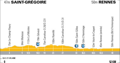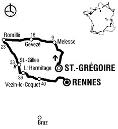 (Ile-et-Vilaine) : Saint-Grégoire (km 0) - Melesse (km 9) - La Mézière (km 12.5) - Gévezé (km 16.5-chrono) - D28 Carr. D231 (km 19) - Romillé (km 23) - D21 Carr. D31 (km 27) - Saint-Gilles (km 33-ravitaillement) - L'Hermitage (km 36.5-chron) - Vezin-le-Coquet (km 40.5) - Rennes / entrée (km 43.5) - Rennes / Bd d'Armorique (km 48) - Rennes (km 52.).