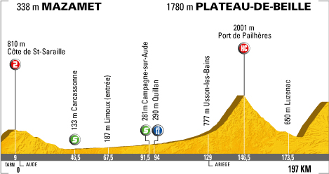 11h45 (Tarn) : D118 Mazamet (km 0) - Aussillon (près de) (km 0.5) - Côte Saint-Sarailles (km 9-GPM2) - (Aude) : Le Cun (km 10.5) - Les Martyrs (km 13) - Caudebronde (près de) (km 19) - Cuxac-Cabardes (km 21.5) - Villegailhenc (km 36.5) - Villemoustaussou (km 38.5) - Carcassonne (km 46.5-sprint) - Villalbe (km 50) - Preixan (près de) (km 55) - Rouffiac d'Aude (près de) (km 58) - Limoux (km 67.5) - Alet-les-Bains (près de) (km 79) - Couiza (km 86) - Esperaza (km 89.5) - Campagne-sur-Aude (km 91.5-sprint) - D118 Quillan (km 94-ravitaillement) - D117 Belviannes-et-Cavirac (km 101.5) - D118 Axat (km 110) - Gesse (km 120) - Usson-les-Bains (km 129) - (Ariège) : D16 Rouze (km 133) - D116 Mijanès (km 135.5) - D25 Port de Pailhères (km 146.5-GPM.HC) - Lavail (km 157.5) - Ascou (km 160.5) - D613 Ax-les-Thermes (km 164.5) - N20 Savignac-les-Ormeaux (km 167) - Luzenac (km 173.5) - La Remise (km 177.5) - Albies (km 178.5) - D522a Les Cabannes (km 180.5) - D522 Plateau de Beille (km 197-GPM.HC).