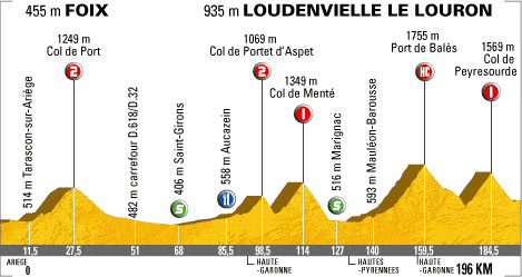 11h25 (Ariège) : Foix (km 0) - D8b Amplaing (km 4.5) - D618 Tarascon-sur-Ariège (km 11.5) - Bedeilhac (km 14.5) - Saurat (km 17) - Col de Port (km 27.5-GPM2) - Massat (km 40.5) - Castet-d'Aleu (km 51) - Saint-Girons (km 68-sprint) - Moulis (km 72.5) - Audressein (km 80.5) - Aucazein (km 85.5-ravitaillement) - Saint-Lary (km 93) - (Haute-Garonne) : Col de Portet d'Aspet (km 98.5-GPM2) - D44 Col de Menté (km 114-GPM1) - Saint-Béat (km 123.5) - Marignac (km 127-sprint) - Cierp-Gaud (km 128) - D825 Esténos (km 131.5) - (Hautes-Pyrénées) : D924 Sidaran (km 134.5) - Mauléon-Barousse (km 140) - D925 Ferrère (km 143) - Port de Balès (km 159.5-GPM.HC) - (Haute-Garonne) : D51d Bourg d'Oueil (km 165.5) - D618 Saint-Aventin (km 175.5) - Cazeaux-de-Larboust (km 177.5) - Col de Peyresourde (km 184.5-GPM1) - (Hautes-Pyrénées) : Loudenvielle-le-Louron / Plate-forme du Rioutor (km 196).