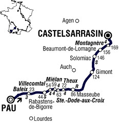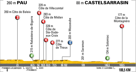 13h00 (Pyrénées-Atlantiques) : D943 Pau (km 0) - Berlanne (km 2) - Haute-Vue (km 5) - Saint-Jammes (km 9.5) - D7 Gabaston (km 11) - Baleix (km 19) - Côte de Baleix (km 23-GPM3) - Casteide-Doat (km 31) - (Hautes-Pyrénées) : D6 Vic-en-Bigorre (km 35.5) - D934 Rabastens-de-Bigorre (km 44.5-sprint) - (Gers) : N21 Villecomtal-sur-Arros (km 48.5) - Côte de Villecomtal (km 54-GPM4) - Côte de Miélan (km 59) - Miélan (km 60) - D127 Côte de Sainte-Dode-aux-Croix (km 63.5-GPM4) - Sainte-Dode (km 65) - D939 Saint-Michel (km 70) - D127 Côte de Theux (km 72.5-GPM4) - Saint-Élix-Theux (km 74) - Saint-Arroman (près de) (km 79) - D27 Masseube (km 86-ravitaillement) - Meilhan (km 94.5) - D12 Simorre (km 100.5) - Saramon (km 109) - Boulaur (près de) (km 112) - Tirent-Pontejac (km 114.5) - Gimont (km 124.5) - Mauvezin (km 136.5) - D928 Solomiac (km 146.5-sprint) - (Tarn-et-Garonne) : Gimat (km 152) - Beaumont-de-Lomagne (km 156.5) - Larrazet (km 167) - Côte de la Montagnère (km 169.5-GPM4) - D45 Bénis (km 182) - Castelsarrasin / entrée (km 186) - Castelsarrasin / Av. du Maréchal Juin (km 188.5).