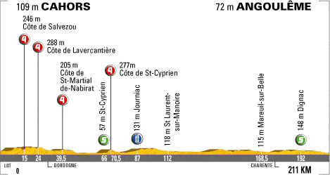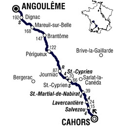 D35 Campagne (km 76) - Le Bugue (km 79.5) - D710 Journiac (km 87-ravitaillement) - La Douze (km 100) - Niversac (km 111) - N221 Boulazac (km 117.5) - Trélissac (km 119) - D6021 Périgueux (km 122) - D939 Les Grèzes (km 128) - Château-l'Évêque (km 132.5) - Brantôme (près de) (km 147.5) - Vieux-Mareuil (km 164.5) - Mareuil-sur-Belle (près de) (km 168.5) - La Rochebeaucourt-et-Argentine (km 177.5) - (Charente) : Gardes-le-Pontaroux (km 185.5) - Dignac (km 192-sprint) - Sainte-Catherine (km 199) - Soyaux (km 202.5) - Angoulême / entrée (km 205.5) - D699 L'Isle-d'Espagnac (km 209) - Angoulême / Av. Jean Mermoz (km 211).