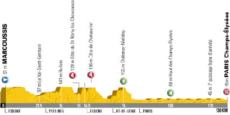 13h50 (Essonne) : D446 Marcoussis (km 0) - Les Ullis (près de) (km 2.5) - D988 Gometz-la-Ville (km 8) - Vaugrineuse (km 16) - Le Marais (km 20) - D27 Le-Val-Saint-Germain (km 22.5) - (Yvelines) : Rochefort-en-Yvelines (km 29) - D149 Bullion (km 34) - D906 Bel-Air (km 42.5) - Chevreuse (km 46.5) - Saint-Rémy-lès-Chevreuse (km 48.5) - D938 Saint-Rémy-lès-Chevreuse (km 51-GPM4) - Magny-les-Hameaux (km 52) - Côte de Châteaufort (km 54-GPM4) - (Essonne) : D36 Le-Christ-de-Saclay (km 59) - Saclay (près de) (km 60.5) - D60 Vauhallan (km 62) - Massy (km 66.5) - (Hauts-de-Seine) : D128 Antony (km 70.5) - (Essonne) : D63 Verrières-le-Buisson (près de) (km 69.5) - (Hauts-de-Seine) : D128 Antony (km 70.5) - Châtenay-Malabris (km 74-sprint) - D2 Le-Plessis-Robinson (km 75) - Clamart (km 76) - D406 Meudon (km 80) - Issy-les-Moulineaux (km 82.5) - D50 Boulogne-Billancourt (km 85.5) - (Paris) : D1 Paris (km 85.5) - Pont de Grenelle (km 87) - Place de la Concorde (km 93.5) - Champs-Élysées / 1er passage (km 94) - 3ème pass. (km 107) - Hauts des Champs (km 108-sprint) - 4ème pass. (km 113.5) - 6ème pass. (km 126.5) - 8ème pass. (km 139.5) - Paris / Champs-Élysées (km 146).