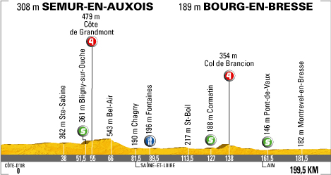 12h50 (Côte-d'Or) : Semur-en-Auxois (km 0) - Villeneuve-sous-Charigny (km 4.5) - Maison-de-Paille (km 10) - D970 Saint-Thibault (km 14) - Gissy-le-Vieil (près de) (km 21.5) - Pouilly-en-Auxois (km 27.5) - D981 Porte de Bourgogne (km 30.5) - D970 Sainte-Sabine (km 38) - Bligny-sur-Ourche (km 51.5-sprint) - Lusigny-sur-Ourche (km 52) - D17 Côte de Grandmont (km 55-GPM4) - Montceau-et-Écharnant (km 56) - Ivry-en-Montagne (près de) (km 60) - D906 Bel-Air (km 66) - (Saône-et-Loire) : Chagny (km 81.5) - D981 Rully (km 85.5) - Fontaines (km 89.5-ravitaillement) - Givry (km 96) - Rosey (près de) (km 102) - Buxy (km 105.5) - Saint-Boil (km 113.5) - Cormatin (km 127-sprint) - D14 Chapaize (km 131) - Col de Brancion (km 138-GPM4) - Martailly-les-Brancion (km 139) - D161 Cruzille (km 142.5) - Bissy-la-Mâconnaise (km 145) - D82 Lugny (km 147) - D55 Thurisset (km 151.5) - Fleurville (km 155) - (Ain) : D933a Pont-de-Vaux (km 161.5-sprint) - D26 Saint-Étienne-sur-Reyssouze (km 167) - Béréziat (km 174) - Marsonnas (km 177.5) - D28 Les Curtils (km 181) - Montrevel-en-Bresse (km 181.5) - Attignat (km 188) - D1079 La Neuve (km 197.5) - Bd Lévrier / Bourg-en-Bresse (km 199.5).