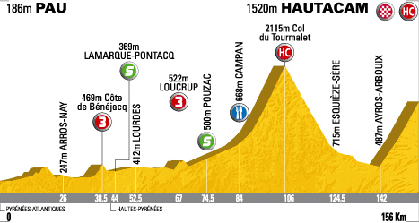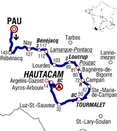 ![]() lundi 14 juillet 2008 ![]() 13h05 (Pyrénées-Atlantique) : N134 Pau (km 0) - Gan (km 3.5) - D934 Rebenac (km 12.5) - D936 Les Pindats (km 19.5) - Le Petit Hameau (km 23) - Arros-Nay (km 26) - Bourdettes (km 27) - Nay (km 28.5) - Benejacq (km 33) - Côte de Benejacq (km 38.5-GPM3) - Labatmale (km 39.5) - Pontacq (km 42) - (Hautes-Pyrénées) : D175 Lamarque-Pontacq (km 44-sprint) - D940 Barlest (km 46.5) - Loubajac (km 49.5) - Poueyferre (près de) (km 50.5) - Lourdes (km 52.5) - Arcizac-et-Angles (km 60.5) - Escoubes (km 63) - Le Hameau (km 65) - Loucrup (km 67-GPM3) - Montgaillard (km 70) - D935 Trébons (km 72) - Pouzac (km 74.5-sprint) - Bagnères-de-Bigorre (km 76) - Beaudean (km 81.5) - Campan (km 84-ravitaillement) - Galade (km 85.5) - Rimoula (km 86.5) - Sainte-Marie-de-Campan (km 89) - D918 Cabadur (km 92) - Gripp (km 93) - Artigues-Campan (km 96) - La Mongie (km 101.5) - Col du Tourmalet (km 106-GPM.HC) - Barèges (km 116.5) - Esterre (km 123) - Luz-St-Sauveur (km 123) - Esquièze-Sère (km 124.5) - D100 Ayros-Arbouix (km 142) - Arbouix (km 144) - Souin (km 145.5) - Artalens (km 147) - Hautacam (km 156-GPM.HC). ![]() ![]() ![]() 170 partants Météo : beau temps - Au km 10, un groupe de 24 coureurs se détache parmi lesquels figurent 8 Français mais aussi De la Fuente, Pozzato, Wegmann, Fothen etc. L'équipe Milram impose un train soutenu au peloton et l'écart se stabilise autour de 1'30". Après la traversée de Lourdes au km 54, le groupe de tête se scinde et ils ne sont plus que 7 devant : Cancellara, Dupont, Di Gregorio, Roy, Duque, Fothen & Freire. Le reste des échappés est repris au km 63. Bichot s'intercale et se rapproche des leaders tandis que le peloton voit l'écart augmenter : 5' au km 76, 6'50" au ravitaillement de Campan (km 84). Le groupe des 7 aborde le Tourmalet avec 15" d'avance sur Bichot et 8'55" sur le peloton. - Sur les premières rampes du col, Di Gregorio fait le ménage parmi les échappés et part seul alors qu'il reste 61 kilomètres avant la ligne d'arrivée. Il maintient 7'45" à La Mongie (km 101.5) et derrière, Cunego et Valverde sont décrochés peu après du groupe des favoris. Di Gregorio franchit le col du Tourmalet (km 106) en tête mais son avance a fondu : 2'05" sur Roy, Dupont & Duque, 5'55" sur Ricco qui mène le groupe de favoris (14 coureurs). Valverde passe 50" plus tard. - Dans la descente, Cancellara et Voigt font le forcing le groupe maillot jaune et Cunego et Valverde ne peuvent recoller. Di Gregorio perd du terrain : 3'25" au panneau des 25 kilomètres et il doit aborder la montée finale avec seulement 40" d'avance sur le groupe des favoris mené par les CSC et 3'15" sur le groupe Cunego / Valverde. Finalement Di Gregorio est repris à 11,5 kilomètres du but alors qu'Andy Schleck et le maillot jaune Kirchen sont lâchés du groupe des favoris. A 10,5 kilomètres, Frank Schleck attaque avec Piepoli et Efimkin. Cobo et Kohl parviennent à revenir sur eux. Cobo mène alors un train infernal pour Piepoli qui attaque à 6 kilomètres du but. F. Schleck et Cobo recollent. Aux 3000 mètres, F. Schleck est virtuel maillot jaune mais il ne peut plus suivre les deux Saunier-Duval qui s'éloignent 600 mètres plus loin. Le duo n'est pas inquiété et Piepoli remporte l'étape devant son co-équipier. F. Schleck est à 28" et c'est Evans qui est le nouveau maillot jaune (il a terminé à 2'17" du vainqueur). Valverde a connu une journée difficile et termine à 5'52". ![]() Étape : ![]() 2. Juan José Cobo (Esp) 3. Fränk Schleck (Lux) à 28" 5. Vladimir Efimkin (Rus) à 2'05" 7. Carlos Sastre (Esp) 8. Cadel Evans (Aus) 9. Denis Menchov (Rus) 10. Christian Vandevelde (Usa) 11. Moises Dueñas (Esp) à 2'27" 12. Stéphane Goubert (Fra) à 2'49" 13. Vincenzo Nibali (Ita) à 3'40" 14. Mikel Astarloza (Esp) à 3'58" 15. Kim Kirchen (Lux) à 4'19" 16. Samuel Sanchez (Esp) à 5'22" 17. Tadej Valjavec (Slo) à 5'27" 18. Damiano Cunego (Ita) à 5'51" 19. Alejandro Valverde (Esp) à 5'52" 20. Laurens Ten Dam (Hol) à 5'54" 21. Sandy Casar (Fra) à 6'41" 22. Oscar Pereiro (Esp) à 7'03" 23. Maxime Monfort (Bel) 24. Roman Kreuziger (Tch) 25. Kanstantsin Siutsou (Blr) à 7'34" 27. Hubert Dupont (Fra) à 8'13" 28. Andy Schleck (Lux) à 8'59" 29. Rémy Di Gregorio (Fra) à 9'09" 30. Jérémy Roy (Fra) 31. Dario-David Cioni (Ita) à 9'37" 32. Rémi Pauriol (Fra) 33. Amets Txurruka (Esp) à 10'39" 34. David Moncoutié (Fra) à 11'20" 35. Matteo Carrara (Ita) à 11'27" 36. Markus Fothen (All) à 12'48" 37. Marzio Bruseghin (Ita) à 13'14" 38. Paolo Tiralongo (Ita) 39. David Arroyo (Esp) 40. Eduardo Gonzalo (Esp) 41. Amaël Moinard (Fra) à 13'16" 42. Oscar Freire (Esp) à 14'05" 43. Jens Voigt (All) 44. Leonardo Duque (Col) 45. Stijn Devolder (Bel) à 14'38" 46. Yaroslav Popovych (Ukr) à 15'58" 47. Mario Aerts (Bel) 48. John-Lee Augustyn (Afs) à 16'20" 49. Fabian Cancellara (Sui) à 16'23" 50. Christian Knees (All) à 16'31" 51. Alexandre Botcharov (Rus) 52. Sylwester Szmyd (Pol) à 18'59" 53. Trent Lowe (Aus) à 22'36" 54. Marco Velo (Ita) à 24'28" 55. Cyril Dessel (Fra) 56. José Luis Arrieta (Esp) 57. José Ivan Gutierrez (Esp) 58. Erik Zabel (All) 59. David Lopez Garcia (Esp) 60. Bram Tankink (Hol) 61. Marco Marzano (Ita) 62. David Le Lay (Fra) 63. Thor Hushovd (Nor) 64. Kurt-Asle Arvesen (Nor) 65. Stef Clement (Hol) 66. Pierrick Fedrigo (Fra) 67. Egoi Martinez (Esp) 68. Josep Jufre (Esp) 69. Ryder Hesjedal (Can) 70. Sylvain Chavanel (Fra) 71. Haimar Zubeldia (Esp) 72. Matteo Bono (Ita) 73. Ruben Perez (Esp) 74. Adam Hansen (Aus) 75. George Hincapie (Usa) 76. Jérôme Pineau (Fra) 77. Thomas Lövkvist (Sue) 78. Benoît Vaugrenard (Fra) 79. Christophe Le Mével (Fra) 80. Sébastien Rosseler (Bel) 81. Volodymir Gustov (Ukr) 82. Johann Tschopp (Sui) 83. Sven Krauss (All) 84. Dmitriy Fofonov (Kaz) 85. Joost Posthuma (Hol) 86. Pieter Weening (Hol) 87. Jürgen Van de Walle (Bel) 88. Yoann Le Boulanger (Fra) 89. Juan Antonio Flecha (Esp) 90. Nic
