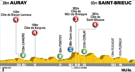 ![]() dimanche 6 juillet 2008 ![]() 13h15 (Morbihan) : D768 Auray (km 0) - Les Quatre Chemins (km 3) - Tréavrec (km 6.5) - Landaul (km 8) - D16 Pluvigner (km 13.5) - Bieuzy-Lanvaux (km 21.5) - D779 Côte de Bieuzy-Lanvaux (km 23.5-GPM4) - La Loge Charlotte (km 26.5) - Camors (km 28.5-sprint) - Baud (km 31.5) - D3 Pont-Augan (km 39.5) - Côte de Kergroix (km 43-GPM4) - Kéramour (km 45) - Bubry (km 50.5) - D2 Kervalan (km 53.5) - Melrand (km 56) - Kerrivalain (km 57.5) - La Croix-Rouge (km 58.5) - Kergost (km 60.5) - Boderel (km 64.5) - Le Sourn (km 68.5) - D2 Pontivy (km 74-sprint) - Saint-Éloi (km 76.5) - Neulliac (km 80.5) - (Côtes d'Armor) : Saint-Jean (km 86.5-ravitaillement) - Mûr-de-Bretagne (km 88) - Côte de Mûr-de-Bretagne (km 92-GPM3) - Côte de Saint-Mayeux (km 96-GPM4) - Corlay (km 103-sprint) - Col de la Clarté (km 114) - D5 Saint-Pever (km 125) - D4 Senven (km 129.5) - La Croix-des-Maisons (km 131.5) - Lanrodec (km 133.5) - Plouagat (km 136.5) - D712 Mississipi (km 138.5) - Châtelaudren (km 139) - Plerneuf (près de) (km 146) - Trémuson (km 149) - D36 Le Sépulcre (km 152) - D24 Pont de Gouet (km 157.5) - Le Légué (km 159) - Saint-Brieuc / entrée (km 159.5) - Saint-Brieuc / rue Pierre de Coubertin (km 164.5). ![]() ![]() ![]() 179 partants Météo : temps couvert, averses éparses, vent fort souvent 3/4 favorable. - Danny Pate attaque au km 0. Sy. Chavanel, Fischer et Wegmann réagissent et la course devient animée mais l'équipe Bouygues, qui défend le maillot à pois de Voeckler, y met bon ordre. Chavanel passe en tête la côte de Bieuzy-Lanvaux au km 23.5 devant Voeckler. les deux coureurs continuent sur leur lancée et creuse rapidement un écart conséquent : 4' dans la côte de Kergroix (km 43). Leur avance culmine à 5'35" au km 60 mais les Caisse d'Épargne et Crédit Agricole accélèrent l'allure du peloton. - Moreau et Le Lay, tous deux d'Agritubel, sortent du peloton dans l'ascension de la côte de Mûr-de-Bretagne et grapillent quelques points au classement de la montagne. Ils insistent et parviennent à rejoindre Chavanel et Voeckler au km 107 soit quatre Français en tête ! A 33 kilomètres du but, l'écart est descendu à 1'30" sous l'effort important de la Française des Jeux, relayée aux 25 kilomètres par Quick Step. A 20 bornes de la ligne, les échappés résistent bien et ont encore 1' mais ils abordent la dernière bosse, longue de 1800 mètres (côte du Légué non classée), avec une avance de 28". Chavanel attaque aux 2800 mètres mais il est repris par L.L. Sanchez, équipier du maillot jaune. - Aux 1200 mètres, Cancellara jaillit du peloton. Pozzato le prend en chasse et revient à 500 mètres du but avec le peloton derrière lui. L'emballage est lancé. Thor Hushovd s'impose dans ce sprint massif devant Kirchen et Ciolek, tous deux de l'équipe Columbia. Alejandro Valverde conserve son maillot jaune. Kirchen est maillot vert tandis que Voeckler a conforté son maillot à pois. ![]() Étape : ![]() 1. Thor Hushovd (Nor) en 3h45'13" (moy: 43.824 km/h) 2. Kim Kirchen (Lux) 3. Gerald Ciolek (All) 4. Robert Hunter (Afs) 5. Erik Zabel (All) 6. Yury Trofimov (Rus) 7. Oscar Freire (Esp) 8. Jimmy Casper (Fra) 9. Martin Elmiger (Sui) 10. Leonardo Duque (Col) 11. Vladimir Efimkin (Rus) 12. Alejandro Valverde (Esp) 13. Juan José Cobo (Esp) 14. Martijn Maaskant (Hol) 15. Mikel Astarloza (Esp) 16. Samuel Sanchez (Esp) 17. Robbie McEwen (Aus) 18. Tadej Valjavec (Slo) 19. Andy Schleck (Lux) 20. Dmitriy Fofonov (Kaz) 21. Cadel Evans (Aus) 22. John-Lee Augustyn (Afs) 23. George Hincapie (Usa) 24. Christian Knees (All) 25. Vincenzo Nibali (Ita) 26. David Millar (Gbr) 27. Mark Cavendish (Gbr) 28. Alexandre Botcharov (Rus) 29. Denis Menchov (Rus) 30. Jérôme Pineau (Fra) 31. Christian Vandevelde (Usa) 32. Carlos Barredo (Esp) 33. Markus Fothen (All) 35. Baden Cooke (Aus) 36. Manuel Quinziato (Ita) 37. Marco Velo (Ita) 38. Manuel Beltran (Esp) 39. Fränk Schleck (Lux) 40. Luis Leon Sanchez (Esp) 41. Yaroslav Popovych (Ukr) 42. Iñaki Isasi (Esp) 44. Carlos Sastre (Esp) 45. Roman Kreuziger (Tch) 46. Maxime Monfort (Bel) 47. Benoît Vaugrenard (Fra) 48. Stuart O'Grady (Aus) 49. Jens Voigt (All) 50. Sebastian Lang (All) 51. Stijn Devolder (Bel) 52. Bram Tankink (Hol) 53. Paolo Longo-Borghini (Ita) 54. Cyril Dessel (Fra) 55. Filippo Pozzato (Ita) 56. Oscar Pereiro (Esp) 57. Mark Renshaw (Aus) 58. Haimar Zubeldia (Esp) 59. Robert Förster (All) 60. Christophe Moreau (Fra) 61. Laurens Ten Dam (Hol) 62. Marzio Bruseghin (Ita) 63. Dario-David Cioni (Ita) 64. Frederik Willems (Bel) 65. Fabian Cancellara (Sui) 66. Juan José Oroz (Esp) 67. Nicki Sørensen (Dan) 68. José Ivan Gutierrez (Esp) 69. Fabian Wegmann (All) 70. Stéphane Goubert (Fra) 71. Ryder Hesjedal (Can) 72. Geoffroy Lequatre (Fra) 73. Trent Lowe (Aus) 74. Eduardo Gonzalo (Esp) 75. Christophe Le Mével (Fra) 76. Juan Antonio Flecha (Esp) 77. Moises Dueñas (Esp) 78. Jesus Del Nero (Esp) 79. Amets Txurruka (Esp) 80. Gorka Verdugo (Esp) 81. Simon Gerrans (Aus) 82. Rémy Di Gregorio (Fra) 83. Angel Gomez (Esp) 84. José Luis Arrieta (Esp) 85. Florent Brard (Fra) 86. Christophe Brandt (Bel) 87. Volodymir Gustov (Ukr) 88. Sylvain Chavanel (Fra) 89. Josep Jufre (Esp) 90. Murilo Antonio Fischer (Bre) 91. Ruben Perez (Esp) 92. David Le Lay (Fra) 93. Koos Moerenhout (Hol) 94. Peter Velits (Svq) 95. William Frischkorn (Usa) 96. Sebastiaan Langeveld (Hol) 97. Sébastien Chavanel (Fra) 98. Amaël Moinard (Fra) 99. Steven De Jongh (Hol) 100. David Moncoutié (Fra) 101. Sandy Casar (Fra) 102. Mario Aerts (Bel) 103. Freddy Bichot (Fra) 104. Romain Feillu (Fra) 105. Nicolas Vogondy (Fra) 106. Martin Müller (All) 107. Nicolas Jalabert (Fra) 108. Aurélien Passeron (Fra) 109. Thomas Voeckler (Fra) 110. Lilian Jégou (Fra) 111. Philippe Gilbert (Bel) 112. Felix Rafael Cardenas (Col) 113. Matteo Carrara (Ita) 114. Joost Posthuma (Hol) 115. Brett Lancaster (Aus) 116. Egoi Martinez (Esp) 117. Damiano Cunego (Ita) 1