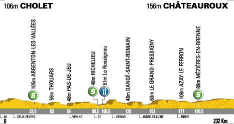 ![]() mercredi 9 juillet 2008 ![]() 11h45 (Maine-et-Loire) : D20 Cholet (km 0) - Mazières-en-Mauge (près de) (km 1) - Maulevrier (km 7.5) - (Deux-Sèvres) : Nueil-les-Aubiers (km 21.5) - Argenton-les-Vallées (km 33.5-sprint) - D759 Massais (km 42.5) - La Croix d'Ingand (km 47.5) - Vrines (km 50.5) - Thouars (km 53) - Orbé (près de) (km 60) - Pas-de-Jeu (km 69) - (Vienne) : Saint-Laon (près de) (km 71.5) - Baussay (km 76) - Loudun (km 79) - Messemé (près de) (km 87.5) - Joué (près de) (km 90.5) - La Polka (km 92) - Pouant (km 94.5) - (Indre-et-Loire) : D58 Richelieu (km 98.5-sprint) - D749 Mosson (km 100.5) - Le Rossignou (km 100.5-ravitaillement) - Razines (près de) (km 105) - Milly (km 107) - Jaulnay (km 109) - (Vienne) : St-Gervais-les-Trois-Clochers (près) (km 113.5) - Les Quatre-Routes (km 114.5) - D22 Leigné-sur-Usseau (km 116) - Mondion (près de) (km 119) - Velleches (km 122.5) - La Ronde (km 124) - D1 Dangé-Saint-Romain (km 128) - D58 Saint-Sulpice (km 133) - Buxeuil (près de) (km 138) - (Indre-et-Loire) : D31 Descartes (km 138.5) - D42 Abilly (km 145.5) - Le Grand-Pressigny (km 152-sprint) - Étableau (km 154.5) - Preuilly-sur-Claise (km 165) - (Indre) : D925 Azay-Le-Ferron (km 177) - Carcot (km 182.5) - Paulnay (km 183) - Mézières-en-Brenne (km 190.5) - Subtray (km 193) - Corbançon (km 194) - Vendoeuvres (km 201) - Claise (km 208) - La Croix-Rouge (km 217.5) - Saint-Maur (près de) (km 224) - Châteauroux / entrée (km 226) - Châteauroux / Av. der la Châtre (km 232). ![]() ![]() ![]() 178 partants Météo : temps ensoleillé. - R.A.S jusqu'au km 11 où Jégou place une attaque. Il est rapidement rejoint par Brard et le champion de France Vogondy et c'est la bonne échappée. Jégou est le mieux placé au C.G. à 4'45". Au km 12, Soler abandonne des suites de sa chute. Vers le quarantième kilomètre, Jégou est déjà maillot jaune virtuel et l'écart atteint son apogée au km 52 avec 8'20". - Près de Richelieu (km 98.5), Valverde est victime d'une chute, sans gravité. A 70 kilomètres de la ligne d'arrivée, les équipes Columbia et Crédit Agricole mettent en route vigoureusement et les fuyards ne possèdent plus qu'une minute d'avance aux 15 kilomètres puis 24" au panneau des 5 kilomètres. - Le peloton revient sur les talons du trio français quand Vogondy place une attaque aux 1500 mètres. Il résiste héroïquement jusqu'à 30 mètres de la ligne et se fait avaler par la meute. Mark Cavendish remporte ce sprint royal pour sa première victoire dans le Tour de France. Stefan Schumacher conserve son maillot jaune. ![]() Étape : ![]() 1. Mark Cavendish (Gbr) en 5h27'52" (moy: 42.456 km/h) 2. Oscar Freire (Esp) 3. Erik Zabel (All) 4. Thor Hushovd (Nor) 5. Baden Cooke (Aus) 6. Robert Hunter (Afs) 7. Leonardo Duque (Col) 8. Robbie McEwen (Aus) 9. Francesco Chicchi (Ita) 10. Julian Dean (Nzl) 11. Robert Förster (All) 12. Gert Steegmans (Bel) 13. Romain Feillu (Fra) 14. Sébastien Chavanel (Fra) 15. Jimmy Casper (Fra) 16. Iñaki Isasi (Esp) 17. Magnus Bäckstedt (Sue) 18. Xavier Florencio (Esp) 19. Jérôme Pineau (Fra) 20. Sven Krauss (All) 21. Nicolas Vogondy (Fra) 22. Ruben Perez (Esp) 23. Juan Antonio Flecha (Esp) 24. Filippo Pozzato (Ita) 25. Vladimir Efimkin (Rus) 27. Johan Van Summeren (Bel) 28. Cadel Evans (Aus) 29. Alessandro Ballan (Ita) 30. Jimmy Engoulvent (Fra) 31. Sebastiaan Langeveld (Hol) 32. Mark Renshaw (Aus) 33. Damiano Cunego (Ita) 34. Maxime Monfort (Bel) 35. Nicolas Jalabert (Fra) 36. Paolo Longo-Borghini (Ita) 37. Markus Fothen (All) 38. William Bonnet (Fra) 39. Bernhard Eisel (Aut) 40. Thomas Lövkvist (Sue) 41. Yaroslav Popovych (Ukr) 42. Fabian Wegmann (All) 43. George Hincapie (Usa) 44. Oscar Pereiro (Esp) 45. Kim Kirchen (Lux) 46. Matteo Carrara (Ita) 47. Yury Trofimov (Rus) 48. Christian Knees (All) 49. Jesus Del Nero (Esp) 50. David Millar (Gbr) 51. Martin Elmiger (Sui) 52. Gerald Ciolek (All) 53. Manuel Beltran (Esp) 54. Marzio Bruseghin (Ita) 55. Martijn Maaskant (Hol) 56. Geoffroy Lequatre (Fra) 57. Stijn Devolder (Bel) 58. Marco Velo (Ita) 59. Christian Vandevelde (Usa) 60. Sylvain Chavanel (Fra) 61. José Ivan Gutierrez (Esp) 62. Arnaud Coyot (Fra) 64. Daniele Righi (Ita) 65. Denis Menchov (Rus) 66. Massimiliano Mori (Ita) 67. Josep Jufre (Esp) 68. Koos Moerenhout (Hol) 69. Murilo Antonio Fischer (Bre) 70. Mauro Facci (Ita) 71. Carlos Barredo (Esp) 72. Roman Kreuziger (Tch) 73. Benoît Vaugrenard (Fra) 74. Bram Tankink (Hol) 75. Cyril Dessel (Fra) 76. Matteo Bono (Ita) 77. Steven De Jongh (Hol) 78. John-Lee Augustyn (Afs) 79. Stuart O'Grady (Aus) 80. Matteo Tosatto (Ita) 81. Andy Schleck (Lux) 82. Dario-David Cioni (Ita) 83. Carlos Sastre (Esp) 84. Juan José Cobo (Esp) 85. Vincenzo Nibali (Ita) 86. Sebastian Lang (All) 87. Sébastien Rosseler (Bel) 88. Samuel Sanchez (Esp) 89. Philippe Gilbert (Bel) 90. Simon Gerrans (Aus) 91. Mario Aerts (Bel) 92. Egoi Martinez (Esp) 93. Peter Velits (Svq) 94. Mikel Astarloza (Esp) 95. Juan José Oroz (Esp) 96. Manuel Quinziato (Ita) 97. Sandy Casar (Fra) 98. Luis Leon Sanchez (Esp) 99. Kanstantsin Siutsou (Blr) 100. Paolo Tiralongo (Ita) 101. Christophe Brandt (Bel) 102. Nicolas Portal (Fra) 103. Alejandro Valverde (Esp) 104. Pierrick Fedrigo (Fra) 105. Trent Lowe (Aus) 106. Tadej Valjavec (Slo) 107. Dmitriy Fofonov (Kaz) 108. Martin Müller (All) 109. William Frischkorn (Usa) 110. Christophe Moreau (Fra) 111. Ralf Grabsch (All) 112. Fabian Cancellara (Sui) 113. Sylwester Szmyd (Pol) 114. David De la Fuente (Esp) 115. Fränk Schleck (Lux) 116. Eduardo Gonzalo (Esp) 117. Haimar Zubeldia (Esp) 118. Stéphane Goubert (Fra) 119. Rubens Bertogliati (Sui) 121. Moises Dueñas (Esp) 122. Rémy Di Gregorio (Fra) 123. Amets Txurruka (Esp) 124. Frederik Willems (Bel) 125. Joost Posthuma (Hol) 126. Hubert Dupont (Fra) 127. Freddy Bichot (Fra) 128. Alexandre Botcharov (Rus) 129. Laurens Ten Dam (Hol) 130. Jérémy Roy (Fra) 131. Jens Voigt (All) 132. Volodymir Gustov (Ukr) 133. Matthieu Sprick (F
