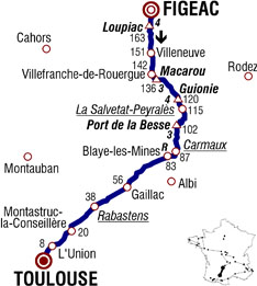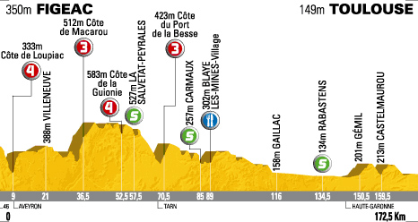 ![]() samedi 12 juillet 2008 ![]() 13h10 (Lot) : D822 Figeac (km 0) - La Madeleine (km 5.5) - (Aveyron) : D922 Loupiac (km 8.5) - Côte de Loupiac (km 9-GPM4) - Fréjeroques (km 12.5) - Encastrades (km 16) - Villeneuve (km 21) - Farrou (km 27.5) - Villefranche-de-Rouergue (km 30) - D911 Côte de Macarou (km 36.5-GPM3) - Le Vidalou (km 37.5) - Les Alets (km 42) - Baraque-Lortal-Solville (km 44.5) - D905a Rieupresens (km 48) - Margat (km 51.5) - Côte de la Guionie (km 52.5-GPM4) - Pradials (km 53) - La Salvetat-Peyrales (km 57.5-sprint) - D905 Port de la Besse (km 66) - (Tarn) : D905 Côte du Port de la Besse (km 70.5-GPM3) - Mirandol-Bougnounac (km 71) - La Moutette (km 76) - Almayrac (km 77.5) - D1088 Carmaux (km 85-sprint) - Blaye-les-Mines (km 86) - D73 Blaye-les-Mines / village (km 89-ravitaillement) - Villeneuve-sur-Vère (km 99.5) - Cestayrols (km 103.5) - D922 Gaillac (km 116) - D988 L'Isle-sur-Tarn (km 127.5) - Rabastens (km 134.5) - Saint-Sulpice (km 141.5) - (Haute-Garonne) : N88 Gemil (km 150.5) - Montastruc-la-Conseillère (km 152) - Garidech (km 155) - Castelmaurou (km 159.5) - Rouffiac-Tolosan (km 161) - Saint-Jean (km 162.5) - L'Union (km 164.5) - Toulouse / entrée (km 167) - Toulouse / Bd. de Lascrosses (km 172.5). ![]() ![]() ![]() 170 partants Météo : temps pluvieux. - La course est extrêmement animée dès le départ et de nombreux coureurs tentent leur chance mais la vitesse du peloton empêche leur réussite (45.6 km dans la 1ère heure). C'est dans la côte de Macarou (km 36.5) que Lefèvre parvient à s'extirper. Il est pris en chasse par De la Fuente, Casar et Le Boulanger qui vont être repris. Lefèvre reste seul en tête et passe en tête au sommet de la côte du Port-de-la-Besse (km 70.5), alors que Txuruka, Pineau et Riblon sont intercalés à 1'30" et que le peloton a 4'10" de retard, puis au km 110, l'écart sera au maximum avec 5'15". Entre-temps, les chasseurs ont rejoint Lefèvre à Carmaux au km 84. - Les Crédit Agricole prennent les choses en main et le peloton se rapproche des fuyards de manière significative, d'autant que la pluie est maintenant permanente. Une chute retarde peu de temps Ricco et Voigt. - Au panneau des 25 kilomètres, le peloton a les fuyards en ligne de mire, à 50". Liquigas se joint à Crédit Agricole et laissent l'échappée "mijoter" à l'avant. Aux 15 kilomètres, Txuruka attaque et n'est suivi que de Pineau. Aux 10 kilomètres, ils résistent car il n'y a plus que Liquigas à rouler derrière eux et ils précèdent la meute de 35". Ils sont malheureusement repris à 3500 mètres de la ligne. Columbia prend alors le sprint à sa charge et on voit même Kirchen le maillot jaune à l'avant. Mark Cavendish s'impose sous une pluie battante devant son co-équipier Ciolek et, après Châteauroux, il remporte sa deuxième étape. Kim Kirchen conserve son maillot kaune. ![]() Étape : ![]() 1. Mark Cavendish (Gbr) en 4h02'54" (moy: 42.610 km/h) 2. Gerald Ciolek (All) 3. Jimmy Casper (Fra) 4. Oscar Freire (Esp) 5. Robert Förster (All) 6. Erik Zabel (All) 7. Gert Steegmans (Bel) 8. Sébastien Chavanel (Fra) 9. Thor Hushovd (Nor) 10. Robert Hunter (Afs) 11. Romain Feillu (Fra) 12. Mark Renshaw (Aus) 13. Ruben Perez (Esp) 14. Iñaki Isasi (Esp) 15. Francesco Chicchi (Ita) 16. Heinrich Haussler (All) 17. Robbie McEwen (Aus) 18. Leonardo Duque (Col) 19. Julian Dean (Nzl) 20. Oscar Pereiro (Esp) 21. Sebastiaan Langeveld (Hol) 22. Juan Antonio Flecha (Esp) 24. Maxime Monfort (Bel) 25. Brett Lancaster (Aus) 26. Martijn Maaskant (Hol) 27. Jesus Del Nero (Esp) 28. Murilo Antonio Fischer (Bre) 29. Baden Cooke (Aus) 30. Denis Menchov (Rus) 31. Juan José Cobo (Esp) 32. Alessandro Ballan (Ita) 33. Stijn Devolder (Bel) 35. Marco Velo (Ita) 36. Matteo Carrara (Ita) 37. Thomas Lövkvist (Sue) 38. Vladimir Efimkin (Rus) 39. Vincenzo Nibali (Ita) 40. Cadel Evans (Aus) 41. Kim Kirchen (Lux) 42. Yaroslav Popovych (Ukr) 43. Bram Tankink (Hol) 44. George Hincapie (Usa) 45. Christian Vandevelde (Usa) 46. José Ivan Gutierrez (Esp) 47. Moises Dueñas (Esp) 48. Sebastian Lang (All) 49. Eduardo Gonzalo (Esp) 50. Markus Fothen (All) 51. William Bonnet (Fra) 52. Paolo Longo Borghini (Ita) 53. Nicolas Jalabert (Fra) 54. Steven De Jongh (Hol) 55. Christian Knees (All) 56. Andy Schleck (Lux) 57. Stuart O'Grady (Aus) 58. Jimmy Engoulvent (Fra) 59. Haimar Zubeldia (Esp) 60. Alejandro Valverde (Esp) 61. Mikel Astarloza (Esp) 62. Marzio Bruseghin (Ita) 63. Jérôme Pineau (Fra) 64. Egoi Martinez (Esp) 65. Kanstantsin Siutsou (Blr) 66. Carlos Sastre (Esp) 67. Damiano Cunego (Ita) 68. Alexandre Botcharov (Rus) 69. Pieter Weening (Hol) 70. Ralf Grabsch (All) 71. Samuel Sanchez (Esp) 72. Yury Trofimov (Rus) 73. Matteo Tosatto (Ita) 74. Tadej Valjavec (Slo) 75. Geoffroy Lequatre (Fra) 76. Cyril Dessel (Fra) 77. William Frischkorn (Usa) 78. Martin Elmiger (Sui) 79. Laurens Ten Dam (Hol) 80. Juan José Oroz (Esp) 81. Dmitriy Fofonov (Kaz) 82. Roman Kreuziger (Tch) 83. Luis Leon Sanchez (Esp) 84. Fabian Cancellara (Sui) 85. Fränk Schleck (Lux) 86. Dario-David Cioni (Ita) 87. John-Lee Augustyn (Afs) 88. Kurt-Asle Arvesen (Nor) 89. Christophe Le Mével (Fra) 91. Josep Jufre (Esp) 92. Hubert Dupont (Fra) 93. Daniele Righi (Ita) 94. Paolo Tiralongo (Ita) 95. Benoît Vaugrenard (Fra) 96. Joost Posthuma (Hol) 97. Marco Marzano (Ita) 98. Mario Aerts (Bel) 99. Simon Gerrans (Aus) 100. Matteo Bono (Ita) 101. Nicolas Portal (Fra) 102. Christophe Brandt (Bel) 103. Stéphane Goubert (Fra) 104. Nicki Sørensen (Dan) 105. Fabian Wegmann (All) 106. Sébastien Rosseler (Bel) 107. Peter Velits (Svq) 108. Sandy Casar (Fra) 109. Samuel Dumoulin (Fra) 110. Rubens Bertogliati (Sui) 111. Martin Müller (All) 112. Gorka Verdugo (Esp) 113. Leif Hoste (Bel) 114. Johan Van Summeren (Bel) 115. Sylvain Chavanel (Fra) 116. Rémy Di Gregorio (Fra) 117. Jürgen Van de Walle (Bel) 118. David Millar (Gbr) 120. Stef Clement (Hol) 121. Florent Brard (Fra) 122. Koos Moerenhout (Hol) 123. Jens Voigt (All)