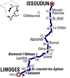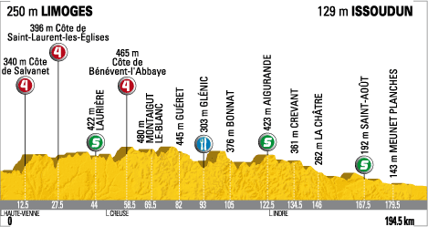 ![]() lundi 13 juillet 2009 ![]() 12h40 (Haute-Vienne) : D29 Limoges (km 0) - Le Palais sur Vienne (km 2.5) - Saint-Priest-Taurion (km 9) - Côte de Salvanet (km 12.5-GPM4) - La Croix-de-Nicard (km 16) - Le Châtenet-en-Dognon (km 20.5) - Le Pont-du-Dognon (km 25.5) - Côte de Saint-Laurent-les-Eglises (km 27.5-GPM4) - Saint-Laurent-les-Eglises (km 28) - Chavanat (km 30) - La Jonchère-Saint-Maurice (km 33.5) - Jabreilles-les-Bordes (près de) (km 38.5) - Col de la Roche (km 40) - Laurière (km 44-sprint) - Baugiraud-les-Mines (km 47.5) - (Creuse) : Marsac (km 54) - Côte de Bénévent-l'Abbaye (km 58.5-GPM4) - Bénévent-l'Abbaye (km 59) - Les Bains (km 63) - Montaigut-le-Blanc (km 69.5) - Rebeyras (km 73.5) - Les Coussières (km 81.5) - Guéret (km 82) - Planchemoreil (km 89) - Laschamp (km 89.5) - Glénic (km 93-ravitaillement) - Bordat (km 101) - Bonnat (km 105) - La Mersolle (km 115.5) - Bellevue (km 122) - (Indre) : Aigurande (km 122.5-sprint) - Le Rimbert (km 128.5) - Crevant (km 134.5) - La Tuilerie (km 136.5) - La Châtre (km 146) - Montgivray (km 151.5) - Nohant (km 155) - St-Chartier (km 157.5) - Villechère (km 160.5) - Vinceuil (km 164) - Saint-Août (km 167.5-sprint) - Ambrault (km 173) - Meunet-Planches (km 179.5) - Issoudun / entrée (km 191) - Issoudun / Bd. Roosevelt (km 194.5). ![]() ![]() ![]() Météo : beau temps. 171 partants - Au km 5, Hupond sort du peloton. Il est rejoint au km 6 par Vaugrenard & Ignatiev. Dumoulin se lance alors en contre-attaque et un passage à niveau qui se ferme devant le peloton favorise son entreprise. Il rattrape les 3 fuyards au km 11. Cependant le peloton ne leur laissera jamais plus de 3'50" d'avance, notamment sous le contrôle de l'équipe Columbia. - Ignatiev ne roule plus et l'écart diminue notamment avec le renfort de l'équipe AG2R du maillot jaune Nocentini. Les échappés sont maintenus sous les deux minutes quand Ignatiev se remet à collaborer à 25 kilomètres du but, alors que le quatuor a moins d'une minute d'avance, puis 30" aux 10 km et 21" aux 5000 mètres. La jonction s'opère à 1.9 km de la ligne et Hushovd tente de prolonger l'action. Il est maitrisé 500 mètres plus loin. - Le sprin est inévitable et Cavendish s'impose à nouveau. Nocentini conserve son maillot jaune. ![]() Étape : ![]() 1. Mark Cavendish (Gbr) en 4h46'43" (moy : 40.702 km/h) 2. Thor Hushovd (Nor) 3. Tyler Farrar (Usa) 4. Leonardo Duque (Col) 5. José Joaquin Rojas (Esp) 6. Lloyd Mondory (Fra) 7. Kenny-Robert Van Hummel (Hol) 8. William Bonnet (Fra) 9. Daniele Bennati (Ita) 10. Saïd Haddou (Fra) 11. Gerald Ciolek (All) 12. Marco Bandiera (Ita) 13. Sebastian Lang (All) 14. Juan Antonio Flecha (Esp) 15. Oscar Freire (Esp) 16. Romain Feillu (Fra) 17. Nicolas Roche (Irl) 18. Ruben Perez (Esp) 19. Mark Renshaw (Aus) 20. Angelo Furlan (Ita) 21. Cadel Evans (Aus) 22. Stuart O'Grady (Aus) 23. Fränk Schleck (Lux) 24. Roman Kreuziger (Tch) 25. Tony Martin (All) 26. Yukiya Arashiro (Jap) 27. Andy Schleck (Lux) 28. Jens Voigt (All) 29. Vincenzo Nibali (Ita) 30. Arnaud Coyot (Fra) 31. Christian Vandevelde (Usa) 32. Greg Van Avermaet (Bel) 33. George Hincapie (Usa) 34. Rinaldo Nocentini (Ita) 35. Fumiyuki Beppu (Jap) 36. Yauheni Hutarovich (Blr) 37. Linus Gerdemann (All) 38. Filippo Pozzato (Ita) 39. Fabian Wegmann (All) 40. Alberto Contador (Esp) 41. Andreas Klöden (All) 42. Egoi Martinez (Esp) 43. Peter Velits (Svq) 44. Brice Feillu (Fra) 45. Yaroslav Popovych (Ukr) 47. Luis Leon Sanchez (Esp) 48. Carlos Sastre (Esp) 49. Anthony Geslin (Fra) 50. Rui Alberto Costa (Por) 51. Koen De Kort (Hol) 52. Mickaël Delage (Fra) 53. Simon Spilak (Slo) 54. Stijn Vandenbergh (Bel) 55. Stéphane Augé (Fra) 56. Julian Dean (Nzl) 57. Alexandre Pichot (Fra) 58. Fabian Cancellara (Sui) 59. Cyril Lemoine (Fra) 60. Johannes Fröhlinger (All) 61. Vladimir Efimkin (Rus) 62. Jérémy Roy (Fra) 63. Kim Kirchen (Lux) 64. Bradley Wiggins (Gbr) 65. Grischa Niermann (All) 66. Bingen Fernandez (Esp) 67. Vladimir Karpets (Rus) 68. 69. Sylvain Chavanel (Fra) 70. Heinrich Haussler (All) 71. Haimar Zubeldia (Esp) 72. Alexandre Botcharov (Rus) 73. Volodymir Gustov (Ukr) 74. Maxime Monfort (Bel) 75. Joost Posthuma (Hol) 76. Nicki Sørensen (Dan) 77. Levi Leipheimer (Usa) 78. Andreas Klier (All) 79. Yury Trofimov (Rus) 80. Serguei Ivanov (Rus) 81. Sandy Casar (Fra) 82. Albert Timmer (Hol) 83. Denis Menchov (Rus) 84. Marcin Sapa (Pol) 85. Christian Knees (All) 86. Christophe Moreau (Fra) 87. Luis Pasamontes (Esp) 88. Bert Grabsch (All) 89. Juan Manuel Garate (Esp) 90. Bernhard Eisel (Aut) 91. Aliaksandr Kuschynski (Blr) 92. Johan Van Summeren (Bel) 93. José Ivan Gutierrez (Esp) 94. Tom Boonen (Bel) 95. Christophe Le Mével (Fra) 96. Stijn Devolder (Bel) 97. Jérôme Pineau (Fra) 98. Peter Wrolich (Aut) 99. Michael Rogers (Aus) 100. Grégory Rast (Sui) 101. Alessandro Ballan (Ita) 102. David Loosli (Sui) 103. Sergio Miguel Paulinho (Por) 104. Gustav-Erik Larsson (Sue) 105. Geoffroy Lequatre (Fra) 106. Hubert Dupont (Fra) 107. Cyril Dessel (Fra) 108. Steven De Jongh (Hol) 109. José Angel Gomez Marchante (Esp) 110. Stéphane Goubert (Fra) 111. Christophe Riblon (Fra) 112. Hayden Roulston (Nzl) 113. Ryder Hesjedal (Can) 114. Gorka Verdugo (Esp) 115. Igor Anton (Esp) 116. Amets Txurruka (Esp) 117. Jürgen Van den Broeck (Bel) 118. Matthew Lloyd (Aus) 119. Frederik Willems (Bel) 120. Chris-Anker Sørensen (Dan) 121. Sébastien Minard (Fra) 122. David Arroyo (Esp) 123. Jussi Veikkanen (Fin) 124. Markus Fothen (All) 125. Pierre Rolland (Fra) 126. Rigoberto Uran (Col) 127. Laurens Ten Dam (Hol) 128. Brett Lancaster (Aus) 129. José Luis Arrieta (Esp) 130. Staf Scheirlinckx (Bel) 131. Marzio Bruseghin (Ita) 132. Pierrick Fedrigo (Fra) 133. Mauro Santambrogio (Ita) 134. Alan Perez (Esp) 135. Mikhail Ignatiev (Rus) 136. Alessandro Vanotti (Ita) 137. David Moncoutié (Fra) 138. Nicolas Vogondy (Fra) 139. Sébastien Rosseler (Bel) 140. Simon Geschke (All) 141. Laurent Lefèvre (Fra) 142. Brian Vandbo