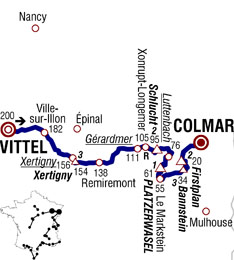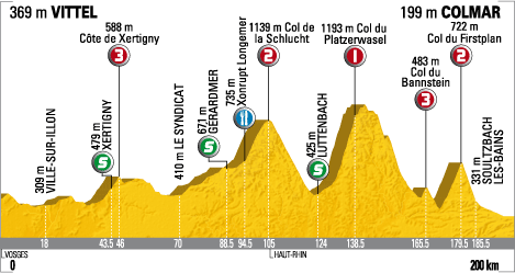 ![]() vendredi 17 juillet 2009 ![]() 12h25 (Vosges) : D165 Vittel (km 0) - Valleroy-le-Sec (km 1) - Valfroicourt (près de) (km 9.5) - Bainville-aux-Saules (km 12) - Gelvécourt (km 15.5) - Les Abeuvenettes (km 16.5) - Ville-sur-Illon (km 18.0) - La Rue (km 21.5) - Harol (km 23.5) - Longeroye (km 24.5) - Le Ménil (km 25.5) - Charmois l'Orgueilleux (km 29) - Les Forges-d'Uzemain D.3 (km 33.5) - Rasey (km 34.5) - Le Void-de-la-Bure (km 37) - Amerey (près de) (km 40.5) - Xertigny (km 43.5-sprint) - Côte de Xertigny (km 46-GPM3) - Bellefontaine (km 49.5) - Hauts-de-Fallières (km 56.5) - Fallières (km 59.5) - Remiremont (km 61.5) - Le Syndicat (km 70.0) - Bémont (km 71.5) - Julienrupt (km 75) - La Forge (km 76.5) - Le Tholy (km 79) - Le Rain-Brice (km 80.5) - Le Beillard (km 118) - Gérardmer (km 88.5-sprint) - Xonrupt-Longemer (km 94.5-ravitaillement) - Col de la Schlucht (km 105-GPM2) - (Haut-Rhin) : Soultzeren (km 117.5) - Stosswihr (km 119) - Munster (km 121.5) - Luttenbach (km 124-sprint) - Breitenbach (km 125) - Muhlbach-sur-Munster (km 125.5) - Metzeral (km 128) - Sondernach (km 129.5) - Col du Platzerwasel D.27 (km 138.5-GPM1) - Le Breitfirst (km 141) - Le Markstein (km 145) - Le Triangle (km 145.5) - Dauvillers (km 155) - Schmelzrunz (km 156.5) - Le Florival (km 158.5) - Linthal (km 158.5) - Lautenbach (km 161.5) - Schweighouse (km 163.5) - Col du Bannstein (km 165.5-GPM3) - Soultzmatt (km 170) - Osenbach (km 173.5) - D40 Col du Firstplan (km 179.5-GPM2) - - Soultzbach-les-Bains (km 185.5) - La Forge (km 189) - Wintzenheim (km 193.5) - Colmar /entrée (km 196.5) - Colmar / Av. de la République (km 200). ![]() ![]() ![]() Météo : temps froid et pluie continue. 166 partants. - Dès le km 3, Moreau et Haussler attaquent. Ils sont rejoints quatre kilomètres plus loin par Voigt, Garate, R. Perez, Uran & Sylvain Chavanel. L'entente règne mais malgré leurs efforts, ils ne parviennent pas à prendre plus de 45" d'avance. Millar tente un contre et échoue. Au km 49, après la côte de Xertigny, le peloton s'est rapproché à 20". - Au km 57, Haussler hausse le rythme et part en compagnie de Chavanel et Perez. Cette fois le peloton laisse filer et le trio compte 8'10" d'avance à Gérardmer (km 88.5). Ils arrivent au pied du col de la Schlucht avec 9'15" sur le peloton. Pour le maillot à pois, Pellizotti et Feillu se lancent dans une contre-attaque avec Martinez mais ils échouent. A 5 kilomètres du sommet, Perez est lâché du groupe de tête et au sommet (km 105) les positions sont : Chavanel et Haussler, à 2' Perez, à 3'10" le peloton maillot jaune. - Après le sommet Feillu et Txurruka partent à la poursuite du duo de tête. Au km 148 Chavanel perd pied dans la descente et Haussler est désormais seul en tête. Le peloton relâche alors la pression, se contentant de surveiller Feillu (à 4'26" au C.G.). - Heinrich Haussler n'est plus inquiété et après 197 kilomètres d'échappée il emporte l'étape avec 4'11" devant Txurruka qui a décroché Feillu et débordé Chavanel en grande difficulté depuis le dernier col. Le peloton est réglé à 6'43" par Velits devant Hushovd. Nocentini est toujours maillot jaune. Hushovd est en vert. ![]() Étape : ![]() 1. Heinrich Haussler (All) en 4h56'26" (moy : 40.481 km/h) 2. Amets Txurruka (Esp) à 4'11" 3. Brice Feillu (Fra) à 6'13" 4. Sylvain Chavanel (Fra) à 6'31" 5. Peter Velits (Svq) à 6'43" 6. Thor Hushovd (Nor) 7. Vladimir Efimkin (Rus) 8. Bradley Wiggins (Gbr) 9. George Hincapie (Usa) 10. Andy Schleck (Lux) 11. Andreas Klöden (All) 12. Thierry Hupond (Fra) 13. Jens Voigt (All) 14. Christian Knees (All) 15. Fränk Schleck (Lux) 16. Grischa Niermann (All) 17. Nicolas Roche (Irl) 18. Matteo Tosatto (Ita) 19. David Loosli (Sui) 20. Alberto Contador (Esp) 21. Jérémy Roy (Fra) 22. Pierre Rolland (Fra) 23. Christian Vandevelde (Usa) 24. Frederik Willems (Bel) 25. Linus Gerdemann (All) 26. Rinaldo Nocentini (Ita) 29. Tony Martin (All) 30. Carlos Sastre (Esp) 31. Cadel Evans (Aus) 32. Johan Van Summeren (Bel) 33. Kim Kirchen (Lux) 34. Vladimir Karpets (Rus) 35. Serguei Ivanov (Rus) 36. Christophe Le Mével (Fra) 37. Maxime Monfort (Bel) 38. Vincenzo Nibali (Ita) 39. Christophe Moreau (Fra) 40. Denis Menchov (Rus) 41. Roman Kreuziger (Tch) 42. Johannes Fröhlinger (All) 43. Gustav-Erik Larsson (Sue) 44. Alexandre Botcharov (Rus) 45. Stéphane Goubert (Fra) 46. Joost Posthuma (Hol) 47. Yaroslav Popovych (Ukr) 48. Luis Leon Sanchez (Esp) 49. Nicki Sørensen (Dan) 50. Luis Pasamontes (Esp) 51. Ryder Hesjedal (Can) 52. Sandy Casar (Fra) 53. Chris-Anker Sørensen (Dan) 54. Gorka Verdugo (Esp) 55. Hubert Dupont (Fra) 56. Haimar Zubeldia (Esp) 57. Carlos Barredo (Esp) 58. Jürgen Van den Broeck (Bel) 59. Christophe Kern (Fra) 60. Sébastien Rosseler (Bel) 61. Igor Anton (Esp) 62. David Millar (Gbr) à 6'54" 63. Volodymir Gustov (Ukr) à 6'56" 64. Matthew Lloyd (Aus) à 6'58" 65. José Angel Gomez Marchante (Esp) 66. Amaël Moinard (Fra) 67. Pierrick Fedrigo (Fra) 68. Yury Trofimov (Rus) 69. David Moncoutié (Fra) 70. Joan Horrach (Esp) à 7'12" 71. Egoi Martinez (Esp) 72. Marzio Bruseghin (Ita) 73. Stijn Devolder (Bel) 74. Sergio Miguel Paulinho (Por) 75. Fabian Cancellara (Sui) à 7'17" 76. Charles Wegelius (Gbr) à 7'23" 77. 78. Sebastian Lang (All) à 11'23" 79. Maxime Bouet (Fra) à 17'43" 80. Ruben Perez (Esp) 81. Stijn Vandenbergh (Bel) à 20'21" 82. Brian Vandborg (Dan) 83. Andreas Klier (All) 84. Hayden Roulston (Nzl) 85. Stuart O'Grady (Aus) 86. Fumiyuki Beppu (Jap) 87. Michael Rogers (Aus) 88. Koen De Kort (Hol) 89. Alessandro Ballan (Ita) 90. Martijn Maaskant (Hol) 91. Filippo Pozzato (Ita) 92. Grégory Rast (Sui) 93. Danny Pate (Usa) 94. Geoffroy Lequatre (Fra) 95. José Ivan Gutierrez (Esp) 96. Jérôme Pineau (Fra) 97. Arnaud Coyot (Fra) 98. Sébastien Minard (Fra) 99. Mauro Santambrogio (Ita) 100. Fabian Wegmann (All) 101. Aliaksandr Kuschynski (Blr) 102. Laurent Lefèvre (Fra) 103. Thomas Voeckler (Fra) 104. Juan Manuel