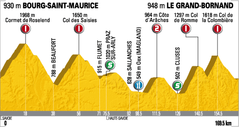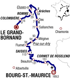 ![]() mercredi 22 juillet 2009 ![]() 12h25 (Savoie) : D902 Bourg-St-Maurice (km 0) - Le Châtelard (km 0.5) - Bonneval (km 4) - Cormet de Roselend (km 18-GPM1) - Col du Méraillet (km 26) - Beaufort (km 38) - La Pierre (km 41.5) - Hauteluce (km 49.5) - Les Pémonts (km 51.5) - Les Saisies (km 54.5) - Col des Saisies (km 56-GPM1) - Les Frasses (km 62) - Notre-Dame-de-Bellecombe (km 67) - La Frassette (km 69) - Flumet (km 71) - (Haute-Savoie) : Praz-sur-Arly (km 75.5-sprint) - Megève (km 79.5) - Demi-Quartier (km 82.5) - Combloux (km 85.5) - Sallanches (km 92) - Oex (km 98.5-ravitaillement) - Bellegarde (km 101) - Magland (km 102) - Balme (km 105) - Araches (km 111.5) - Côte d'Araches (km 111.5-GPM2) - La Frasse (km 113.5) - Saint-Sigismond (km 116) - Châtillon-sur-Cluses (km 119.5) - Cluses (km 126-sprint) - Scionzier (km 128) - Cluses (km 131.5) - Nancy-sur-Cluses (km 136.5) - Col de Romme (km 140.5-GPM1) - Le Reposoir (km 145.5) - Col de la Colombière (km 154.5-GPM1) - Le Chinaillon (km 159) - Le Grand-Bornand / entrée (km 165) - Le Grand-Bornand / Route de l'Envers (km 169.5). ![]() ![]() ![]() Météo : temps ensoleillé, 32° 161 partants. - Les attaques se multiplient dès le départ et Chavanel sort au km 5, dans les premières pentes du Cormet de Roselend. Dans la suite, un groupe de 12 coureurs se forme : Chavanel, Van den Broek, Menchov, Zabriskie, R. Perez, Verdugo, Arrieta, Pellizotti, Casar, Uran, Pauriol & Lequatre. A deux kilomètres du sommet, Montfort, Rolland & Bruseghin reviennent sur ce groupe. Peu avant le sommet franchi en tête par Pellizotti (km 18), Voeckler et Hushovd sprintent et foncent dans la descente, récupèrent Kern, Txurruka et Martinez intercalés. Les 5 se joignent au groupe de tête soit désormais 20 coureurs en tête dont le mieux placé est Casar à 5'40". Le peloton suit à 2'. - Au bas du col des Saisies à Flumet (km 71), le maillot vert Hushovd prend les devants en vue du sprint intermédiaire du km 75.5 qu'il remporte et il poursuit son effort seul en tête jusqu'au sprint suivant de Cluses au km 126. Cette action lui vaudra le prix de la combativité. Il se relève alors et se fait débordé quelques kilomètres plus loin, au pied du col de Romme. Dans la montée, Sastre place la 1ère escarmouche mais il est maitrisé. A 5 km du sommet, Frank Schleck attaque, épaulé par son frère Andy. Le groupe maillot jaune explose et Armstrong est comme hier, à la peine. Au sommet du col de Romme, à 29 kilomètres du but, le groupe F & A.Schleck, Contador et Klöden possède 1'02" d'avance sur le groupe Nibali, Van de Velde, Wiggins, Armstrong. Au pied du col de la Colombière l'écart est passé à 1'20". - Dans l'ascension du dernier col de la journée, Frank Schleck fait le forcing mais Contador place un contre à 1500 mètres du col avant de s'apercevoir que son co-équipier Klöden ne suit pas et ne pourra pas l'épauler. Il attend alors les Schleck tandis que derrière, Armstrong décroche Wiggins. Au sommet (km 154.5), les frères Schleck et Contador passent avec 1'15" sur Klöden en difficulté, 2'06" sur Armstrong. Nibali revient sur l'Américain et le duo récupère Klöden aux 3000 mètres. Contador ne dispute pas la victoire aux frères luxembourgeois et Frank Schleck s'impose. Nibali et Armstrong terminent à 2'18". Alberto Contador reste maillot jaune avec 2'26" sur Andy et 3'25" sur Frank. Armstrong peut encore rêver au podium à 3'55" du leader. ![]() Étape : ![]() 1. Fränk Schleck (Lux) en 4h53'54" (moy : 34.604 km/h) 2. Alberto Contador (Esp) 3. Andy Schleck (Lux) 4. Vincenzo Nibali (Ita) à 2'18" 6. Andreas Klöden (All) à 2'27" 7. Bradley Wiggins (Gbr) à 3'07" 8. Christophe Moreau (Fra) à 4'09" 9. Christian Vandevelde (Usa) 10. Rémi Pauriol (Fra) à 6'10" 11. Christophe Le Mével (Fra) 12. Maxime Monfort (Bel) à 6'12" 13. Roman Kreuziger (Tch) 14. Rinaldo Nocentini (Ita) 15. Vladimir Karpets (Rus) 16. Jürgen Van den Broeck (Bel) 17. Sandy Casar (Fra) 18. 19. Stéphane Goubert (Fra) à 6'15" 20. José Luis Arrieta (Esp) à 6'19" 21. Sylvain Chavanel (Fra) à 7'01" 22. Sébastien Minard (Fra) à 7'47" 23. Matthew Lloyd (Aus) 24. Sylvain Calzati (Fra) 25. Carlos Sastre (Esp) 26. Ryder Hesjedal (Can) 27. Alexandre Botcharov (Rus) 28. David Arroyo (Esp) à 7'50" 29. Serguei Ivanov (Rus) à 8'30" 30. David Loosli (Sui) à 8'54" 31. Christian Knees (All) 32. Carlos Barredo (Esp) 33. Hubert Dupont (Fra) 34. Pierre Rolland (Fra) 35. Rigoberto Uran (Col) à 8'58" 36. Stijn Vandenbergh (Bel) à 11'00" 37. Egoi Martinez (Esp) 38. Christophe Kern (Fra) à 11'20" 39. Brice Feillu (Fra) à 11'50" 40. Grischa Niermann (All) 41. Nicolas Roche (Irl) 42. Joost Posthuma (Hol) 43. Leonardo Duque (Col) 44. George Hincapie (Usa) 45. Marzio Bruseghin (Ita) 46. Stijn Devolder (Bel) 47. Luis Pasamontes (Esp) à 13'30" 48. Ruben Perez (Esp) 49. Sébastien Rosseler (Bel) à 15'33" 50. Nicki Sørensen (Dan) à 17'33" 51. Thomas Voeckler (Fra) 52. Chris-Anker Sørensen (Dan) 53. Laurent Lefèvre (Fra) 54. Jussi Veikkanen (Fin) 55. Haimar Zubeldia (Esp) 56. Linus Gerdemann (All) 57. Sergio Miguel Paulinho (Por) 58. David Zabriskie (Usa) 60. Yaroslav Popovych (Ukr)à 21'31" 61. Iñigo Cuesta (Esp) 62. Juan Antonio Flecha (Esp) 63. Denis Menchov (Rus) 64. Gorka Verdugo (Esp) 25'38" 65. Filippo Pozzato (Ita) 29'43" 66. Alessandro Ballan (Ita) 67. Thierry Hupond (Fra) 68. Koen De Kort (Hol) 69. José Joaquin Rojas (Esp) 70. Stef Clement (Hol) 71. Jérémy Roy (Fra) 72. Mauro Santambrogio (Ita) 73. Simon Spilak (Slo) 74. Maxime Bouet (Fra) 75. Alan Perez (Esp) 76. Juan José Oroz (Esp) 77. Fumiyuki Beppu (Jap) 78. Heinrich Haussler (All) 79. Thor Hushovd (Nor) 80. Volodymir Gustov (Ukr) 81. Cadel Evans (Aus) 82. Brett Lancaster (Aus) 83. Staf Scheirlinckx (Bel) 84. José Ivan Gutierrez (Esp) 85. Juan Manuel Garate (Esp) 86. Nikolai Trussov (Rus) 87. Luis Leon Sanchez (Esp) 88. Gustav-Erik Larsson (Sue) 89. Charles Wegelius (Gbr) 90. Geoffroy Lequatre (