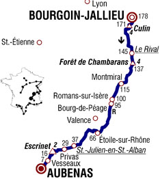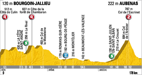 ![]() vendredi 24 juillet 2009 ![]() 12h50 (Isère) : D522 Bourgoin-Jallieu (km 0) - La Moule (km 3) - St-Agnin-sur-Bion (près de) (km 4) - Côte de Culin (km 6.5-GPM4) - Culin (km 7) - Les Roles (km 9) - Meyrieu-les-Etangs (km 12) - Châtonnay (km 14.5) - Saint-Christophe (km 16) - Commelle (km 22) - La Côte-Saint-André (km 27.5) - Le Rival (km 33-sprint) - Saint-Siméon de Bressieux (km 35) - Côte de la forêt de Chambaran (km 40.5-GPM4) - Roybon (km 45) - Col de la Madeleine (km 54.5) - (Drôme) : D52 Montmiral (près de) (km 63) - Saint-Michel-sur-Savasse (km 66) - Les Fayolles (km 71) - Génissieux (km 73.5) - Mours-Saint-Eusèbe (près de) (km 77.5) - Romans-sur-Isère (km 77.5) - Bourg-de-Péage (km 83-ravitaillement) - Alixan (km 88) - Montelier (km 92) - Chabeuil (près) (km 95) - Beaumont-les-Valence (km 104.5) - Monteleger (km 107) - Etoile-sur-Rhône (près de) (km 111.5) - Beauvallon (km 114.5) - (Ardèche) : Charmes-sur-Rhône (km 122.5) - Beauchastel (près de) (km 126.5) - La Voulte-sur-Rhône (km 130) - Les Cabannes (km 131.5) - Le Pouzin (km 135) - Les Fonts de Pouzin (km 138) - Saint-Julien en St-Alban (km 141-sprint) - Flaviac (km 142) - Coux (km 147) - Le Crouzet (km 148) - Privas (km 149) - Le Ruissol (km 152) - Col de l'Arénier (km 160) - Col de l'Escrinet (km 162-GPM2) - Le Mas (km 169.5) - Vesseaux (km 171) - Saint-Privat (km 175) - Ucel (km 176.5) - Aubenas / Avenue de Roca (km 178). ![]() ![]() ![]() Météo : temps ensoleillé. 29°, léger vent de Nord. 158 partants. - Hupond, le régional, sort du peloton, franchit la côte de Culin en tête puis est repris au km 6. Une cassure se produit au km 11 avec Evans, Popovych, Millar, Kirchen, L.L. Sanchez, Arroyo, Arrieta, Duque, Spilak, Barreo & Lequatre. Ils sont rejoints au km 20 par 9 autres coureurs : Chavanel, R. Perez, Riblon, Roche, Bennati, Gutierrez, Vandenbergh, Trusov & Hivert. Trusov est distancé dans la côte de la forêt de Chambaran au km 38 et il ne reste que 19 coureurs à l'avant. L'écart atteint 2'15" au km 50 puis 2'45" au ravitaillement de Bourg-en-Péage (km 83) malgré un rythme soutenu par l'équipe BBox puis Rabobank. L'allure est extrêmement rapide et l'écart se maintient aux alentours de 2'. - L'échappée se scinde dans une bosse au km 115 et cinq coureurs se détachent : Popovych, Gutierrez, Millar, Duque & Arrieta. Les autres sont repris à 50 kilomètres du but. Le peloton se rapproche et Duque insiste seul pendant 4 km avec une dizaine de secondes d'avance mais le regroupement est général au km 146. - Dans la montée du col de l'Escrinet, Lefèvre sort seul au km 153 mais Ballan, champion du monde en titre, revient sur lui avant le sommet. Ils franchissent le col en tête avec 8" d'avance sur une cinquantaine de coureurs du peloton. Le duo parvient à se maintenir en tête dans la descente et jusqu'à l'avant-dernier kilomètre. Le sprint, alors inévitable permet, à Cavendish de s'imposer une nouvelle fois. Une cassure permet à Armstrong de reprendre 4" à ses adversaires. Alberto Contador porte toujours le maillot jaune. ![]() Étape : ![]() 1. Mark Cavendish (Gbr) en 3h50'35" (moy : 46.317 km/h) 2. Thor Hushovd (Nor) 3. Gerald Ciolek (All) 4. Greg Van Avermaet (Bel) 5. Oscar Freire (Esp) 6. Jérôme Pineau (Fra) 7. Fumiyuki Beppu (Jap) 8. Nicolas Roche (Irl) 9. Christophe Le Mével (Fra) 10. Martijn Maaskant (Hol) 11. Geoffroy Lequatre (Fra) 13. Serguei Ivanov (Rus) à 4" 14. Bradley Wiggins (Gbr) 15. Andy Schleck (Lux) 17. Tony Martin (All) 18. Vladimir Karpets (Rus) 19. Rinaldo Nocentini (Ita) 20. Andreas Klöden (All) 21. Jürgen Van den Broeck (Bel) 22. Alexandre Botcharov (Rus) 23. Sebastian Lang (All) 24. Alberto Contador (Esp) 25. Stéphane Goubert (Fra) 26. Vincenzo Nibali (Ita) 27. Fränk Schleck (Lux) 28. Sandy Casar (Fra) 29. Gustav-Erik Larsson (Sue) 30. Roman Kreuziger (Tch) 31. Christophe Moreau (Fra) 32. Gorka Verdugo (Esp) 33. Peter Velits (Svq) 34. Christian Knees (All) 35. Christian Vandevelde (Usa) 36. Egoi Martinez (Esp) 37. Luis Leon Sanchez (Esp) 38. Rigoberto Uran (Col) 39. Matthew Lloyd (Aus) 40. Frederik Willems (Bel) à 12" 41. Linus Gerdemann (All) 42. George Hincapie (Usa) 43. Maxime Monfort (Bel) à 32" 44. Laurent Lefèvre (Fra) à 45" 45. Alessandro Ballan (Ita) à 1'10" 46. Sébastien Minard (Fra) à 1'15" 47. Hubert Dupont (Fra) 48. Sylvain Calzati (Fra) 49. William Bonnet (Fra) 50. Hayden Roulston (Nzl) 51. Pierre Rolland (Fra) à 2'01" 52. Joan Horrach (Esp) 53. Luis Pasamontes (Esp) 54. Ryder Hesjedal (Can) 55. Yukiya Arashiro (Jap) 56. Mickaël Delage (Fra) 57. Filippo Pozzato (Ita) 58. Chris-Anker Sørensen (Dan) 59. Nicki Sørensen (Dan) 60. Julian Dean (Nzl) 61. Jérémy Roy (Fra) 62. Sergio Miguel Paulinho (Por) 63. Aliaksandr Kuschynski (Blr) 64. Cadel Evans (Aus) 65. Michael Rogers (Aus) 66. Charles Wegelius (Gbr) 67. David Loosli (Sui) 68. Matteo Tosatto (Ita) 69. Carlos Sastre (Esp) 70. Amaël Moinard (Fra) 71. Sylvain Chavanel (Fra) 72. Rémi Pauriol (Fra) 73. Brian Vandborg 74. Haimar Zubeldia (Esp) 75. Volodymir Gustov (Ukr) 76. Johannes Fröhlinger (All) 77. Yury Trofimov (Rus) 78. Pierrick Fedrigo (Fra) 79. Thomas Voeckler (Fra) à 2'10" 80. Arnaud Coyot (Fra) à 4'44" 81. Brett Lancaster (Aus) à 4'44" 82. David Moncoutié (Fra) à 4'44" 83. Denis Menchov (Rus) à 5'05" 84. Simon Geschke (All) à 5'17" 85. Brice Feillu (Fra) à 6'31" 86. Steven De Jongh (Hol) 87. Saïd Haddou (Fra) 88. Nicolas Vogondy (Fra) à 7'12" 89. Yaroslav Popovych (Ukr) à 9'31" 91. Johan Van Summeren (Bel) 92. Carlos Barredo (Esp) 93. Koen De Kort (Hol) 94. Thierry Hupond (Fra) 95. Albert Timmer (Hol) 96. Stijn Vandenbergh (Bel) 97. Nikolai Trussov (Rus) 98. Juan Manuel Garate (Esp) 99. José Joaquin Rojas (Esp) 100. Alexandre Pichot (Fra) 101. Marzio Bruseghin (Ita) 102. Daniele Righi (Ita) 103. Lloyd Mondory (Fra) 104. Iñigo Cuesta (Esp) à 9'50" 105. Heinrich Haussler (All) 106. Mark Renshaw (Aus) à 14'27" 107. Stuart O'Grady (Aus) 108. 