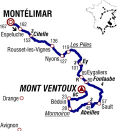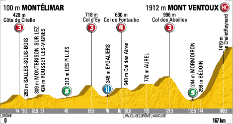 ![]() samedi 25 juillet 2009 ![]() 11h50 (Drôme) : D4 Montélimar (km 0) - Espeluche (km 4.5) - Le Colombier (km 8) - Côte de Citelle (km 14-GPM3) - Salles-sous-Bois (km 18.5) - Taulignan (km 22) - Montbrison-sur-Lez (km 26.5) - Le Pègue (près de) (km 29) - Rousset-les-Vignes (km 31) - Venterol (près de) (km 36.5) - Nyons (km 40) - Aubres (km 45) - Les Pilles (km 48-sprint) - La Bonté (km 49) - Sainte-Jalle (km 59) - Col d'Ey (km 65.5-GPM3) - Buis-les-Baronnies (km 72.5) - Eygaliers (km 78-ravitaillement) - Col de Fontaube (km 87-GPM4) - (Vaucluse) : Col des Aires (km 90.5) - (Drôme) : Carr. D40-D72 (km 95) - Carr. D72-D542 (km 99.5) - (Vaucluse) : Aurel (km 105) - Sault (km 109.5) - La Loge (km 111.5) - Col des Abeilles (km 121.5-GPM3) - Villes-sur-Auzon (km 132.5) - Mormoiron (km 138.5-sprint) - Bédoin (km 144) - Sainte-Colombe (km 149) - Les Bruns (km 150) - Le Chalet-Reynard (km 160.5) - Mont-Ventoux (km 167-GPM HC) ![]() ![]() ![]() Météo : soleil, 29°, vent assez fort parfois en rafales. 156 partants. - Dès le km 3, un groupe de 13 hommes se porte à l'avant : Roulston, Posthuma, Garate, T. Martin, Riblon, Lemoine, Timmer, Kushinsky, Geslin, Dumoulin, Righi, Bonnet & Bouet. Au km 25, R. Perez, Gutierrez et Delage reviennent sur eux. Le peloton ne réagit pas et les fuyards creusent une avance qui atteint 10'30" au km 87, après le ravitaillement d'Eygaliers. - Les Saxo-Bank accélèrent progressivement l'allure du peloton et l'écart diminue pour tomber à 9' à 50 kilomètres de la ligne. Garate passe en tête le col des Abeilles (km 121.5). Les Astana mettent un coup d'accélérateur et fractionnent le peloton. A Bédoin, au pied des premières difficultés du Mont Ventoux (km 144), les échappés abordent l'ascension avec 4'05" d'avance sur l'avant-garde du peloton qui comporte tous les favoris. - A 20 kilomètres du sommet, Garate, T. Martin et Riblon décrochent leurs compagnons puis Riblon est à son tour lâché. Aux 10 kilomètres, Martin et Garate sont en tête 2'06" devant le groupe maillot jaune. Dans ce groupe de favoris, Andy Schleck place plusieurs accélérations, à chaque fois contrées par Contador. En revanche F. Schleck ne parvient jamais à suivre son frère et reste avec Armstrong. Sur le 4ème démarrage, A. Schleck et Contador se détachent bientôt rejoints par Nibali. Au Chalet-Reynard (km 160.5), la situation est la suivante : Garate et Martin en tête, à 1'45" A.Schleck, Contador, Nibali qui ont temporisé et ont laissé revenir le groupe Armstrong, Klöden etc. Pellizotti se lance alors à la poursuite du duo de tête. - A 1200 mètres du but, Garate décroche T. Martin mais celui s'accroche et revient. L'Espagnol démarre à nouveau dans le dernier virage et va cette fois-ci s'imposer au sommet du Mont-Ventoux avec 3" devant Martin. Andy Schleck est 3ème à 38" devant Contador, Armstrong est 5ème à 43". Juan Manuel Garate mérite largement sa victoire sa victoire après 164 kilomètres d'échappée. Alberto Contador confirme sa supériorité dans ce Tour 2009. L'étape de demain est une formalité. ![]() Étape : ![]() 1. Juan Manuel Garate (Esp) en 4h39'21" (moy : 35.869 km/h) 2. Tony Martin (All) à 3" 3. Andy Schleck (Lux) à 38" 4. Alberto Contador (Esp) 6. Fränk Schleck (Lux) à 43" 7. Roman Kreuziger (Tch) à 46" 9. Vincenzo Nibali (Ita) à 58" 10. Bradley Wiggins (Gbr) à 1'03" 11. Jürgen Van den Broeck (Bel) à 1'39" 12. Andreas Klöden (All) à 1'42" 13. Christophe Riblon (Fra) à 1'47" 14. Joost Posthuma (Hol) à 1'56" 15. Christophe Le Mével (Fra) à 2'26" 16. Christian Vandevelde (Usa) à 2'34" 17. Maxime Bouet (Fra) à 2'42" 19. Daniele Righi (Ita) à 3'03" 20. Sylvain Calzati (Fra) à 3'15" 21. Luis Leon Sanchez (Esp) 22. Sandy Casar (Fra) à 3'20" 23. Stéphane Goubert (Fra) 24. Peter Velits (Svq) à 4'23" 25. Igor Anton (Esp) à 4'37" 26. Hayden Roulston (Nzl) à 5'07" 27. Sébastien Minard (Fra) à 5'11" 28. Vladimir Karpets (Rus) à 5'36" 29. Yury Trofimov (Rus) à 5'40" 30. Chris-Anker Sørensen (Dan) à5'42" 31. Nicki Sørensen (Dan) 32. Cadel Evans (Aus) à 5'45" 33. George Hincapie (Usa) 34. Amaël Moinard (Fra) 35. Ryder Hesjedal (Can) 36. Alexandre Botcharov (Rus) 37. Sylvain Chavanel (Fra) 38. Matthew Lloyd (Aus) à 5'47" 39. David Arroyo (Esp) à 5'50" 40. Ruben Perez (Esp) à 5'56" 41. Rinaldo Nocentini (Ita) 42. Aliaksandr Kuschynski (Blr) à 6'05" 43. Anthony Geslin (Fra) à 6'09" 44. José Ivan Gutierrez (Esp) à 6'18" 45. Mickaël Delage (Fra) à 6'26" 46. Albert Timmer (Hol) à à 6'28" 47. Pierre Rolland (Fra) 48. David Moncoutié (Fra) à 6'47" 49. Nicolas Roche (Irl) à 7'13" 50. Rémi Pauriol (Fra) à 7'20" 51. Christian Knees (All) à 7'35" 52. Sergio Miguel Paulinho (Por) à 7'52" 53. Linus Gerdemann (All) à 8'05" 54. Christophe Moreau (Fra) 55. Haimar Zubeldia (Esp) 56. Maxime Monfort (Bel) 57. Hubert Dupont (Fra) 58. Geoffroy Lequatre (Fra) 59. Grischa Niermann (All) 60. Luis Pasamontes (Esp) 61. Johan Van Summeren (Bel) 62. Pierrick Fedrigo (Fra) 63. Charles Wegelius (Gbr) 64. Serguei Ivanov (Rus) 65. Samuel Dumoulin (Fra) 66. Laurens Ten Dam (Hol) à 9'14" 67. Brice Feillu (Fra) à 9'27" 68. Sebastian Lang (All) à 9'33" 69. Thierry Hupond (Fra) 70. Volodymir Gustov (Ukr) à 9'36" 71. Carlos Sastre (Esp) 72. David Loosli (Sui) 73. Joan Horrach (Esp) 74. Christophe Kern (Fra) à 10'12" 75. Laurent Lefèvre (Fra) 76. Jérémy Roy (Fra) 77. Staf Scheirlinckx (Bel) à11'29" 78. Stijn Vandenbergh (Bel) à 11'31" 79. Stijn Devolder (Bel) à 11'52" 80. Simon Geschke (All) à 12'09" 81. Yaroslav Popovych (Ukr) à 13'02" 82. Michael Rogers (Aus) à 13'17" 83. Nicolas Vogondy (Fra) 84. Stef Clement (Hol) à 13'21" 85. Gorka Verdugo (Esp) à 13'28" 86. William Bonnet (Fra) à 13'37" 87. Koen De Kort (Hol) à 13'41" 88. Jérôme Pineau (Fra) 89. Alexandre Pichot (Fra) à 14'10" 90. Cyril Lemoine (Fra) 91. Stéphane Augé (Fra) à 14'24" 92. Fumiyuki Beppu (Jap) à 14'40" 93. José Joaquin Rojas (Esp) à