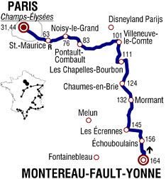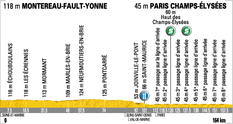 ![]() dimanche 26 juillet 2009 ![]() 13h30 (Seine-et-Marne) : D67 Montereau-Fault-Yonne (km 0) - Forges (km 1.5) - Echouboulains (km 7.5) - Les Ecrennes (km 18.5) - Bréau (km 25.5) - Lady (km 29) - Mormant (km 31.5) - Aubepierre (km 34.5) - Beauvoir (km 37) - Chaumes-en-Brie (km 40) - Visy (km 43.5) - Fontenay-Trésigny (km 45) - Marles-en-Brie (km 48) - La Houssaye-en-Brie (km 50.5) - Les Chapelles-Bourbon (km 52.5) - Neufmoutiers-en-Brie (km 57.5) - Villeneuve-le-Comte (km 62.5) - Villeneuve-Saint-Denis (km 66) - Pontcarré (km 74) - Roissy-en-Brie (km 77) - Pontault-Combault (km 80.5) - Emerainville (km 83) - (Seine-Saint-Denis) : Noisy-le Grand (km 88) - (Val de Marne) : Villiers-sur-Marne (km 90.5) - Bry-sur-Marne (km 92.5) - Champigny-sur-Marne (km 93.5) - Joinville-le-Pont (km 97) - Saint-Maurice (km 101-ravitaillement) - Charenton-le-Pont (km 102.5) - Quai de Bercy (km 104.5) - Quai François Mitterrand (km 105) - (Paris) : Quai Saint-Bernard (km 106.5) - Quai de la Tournelle (km 107.5) - Quai des Grands Augustins (km 109.5) - Quai de Conti (km 110) - Entrée du circuit (km 111) - Place de la Concorde (km 111.5) - 1er passage sur la ligne d'arrivée (km 112) - Haut des Champs-Elysées (km 113.5) - 2ème passage (km 118.5-sprint) - 3ème passage (km 125) - 4ème passage (km 131.5-sprint) - 5ème passage (km 138) - 6ème passage (km 144.5) - 7ème passage (km 151) - 8ème passage (km 157.5) - Paris / Champs-Elysées (km 164). ![]() ![]() ![]() Météo : grand soleil, 29° 156 partants. - Les traditionnelles festivités de la dernière étape marquent le début de la course. Celle-ci ne commence qu'en arrivant sur les Champs-Élysées où il reste 8 tours de 6,5 kilomètres à parcourir. - Le Japonais Beppu s'échappe dans le 1er tour, accompagné de Veikkanen, Coyot, Dumoulin, Pichot, Barredo & Wegmann. Ignatiev tente sans succès de joindre les fuyards. Les "7" prennent jusqu'à 30" d'avance mais les Columbia veillent au grain et les laissent "mijoter" à l'avant. Ils résistent mais à 9000 mètres de la ligne, le groupe se scinde et seuls Beppu, Veikkanen & Wegmann insistent. A la cloche du dernier tour, ils possèdent encore 11" d'avance mais sont repris 1 kilomètre plus loin. Il reste alors 5,5 km à parcourir. - Les Garmin tentent de contrôler l'emballage final mais ils sont débordés par les Columbia dans la rue de Rivoli. Renshaw emmène Cavendish avec autorité et ils ne sont pas inquiétés. Cavendish s'impose encore et montre qu'il est de loin le meilleur sprinter même si c'est Hushovd qui emporte le maillot vert à la régularité. Alberto Contador remporte cette 96ème édition devant Andy Schleck (meilleur jeune) et Lance Armstrong. Pellizotti s'impose dans le classement des grimpeurs. ![]() Étape : ![]() 1. Mark Cavendish (Gbr) en 4h02'18" (moy : 40.611 km/h) 2. Mark Renshaw (Aus) 3. Tyler Farrar (Usa) 4. Gerald Ciolek (All) 5. Yauheni Hutarovich (Blr) 6. Thor Hushovd (Nor) 7. José Joaquin Rojas (Esp) 8. Marco Bandiera (Ita) 9. Daniele Bennati (Ita) 10. William Bonnet (Fra) 11. Lloyd Mondory (Fra) 12. Geoffroy Lequatre (Fra) 13. Nikolai Trussov (Rus) 14. Cyril Lemoine (Fra) 15. Leonardo Duque (Col) 16. Sebastian Lang (All) 17. Matteo Tosatto (Ita) 18. Steven De Jongh (Hol) 19. Fabian Cancellara (Sui) 20. Yukiya Arashiro (Jap) 21. Saïd Haddou (Fra) 22. Sébastien Rosseler (Bel) 23. Fabio Sabatini (Ita) 24. Filippo Pozzato (Ita) 25. Stuart O'Grady (Aus) 26. Andreas Klöden (All) 27. Sylvain Chavanel (Fra) 28. Brett Lancaster (Aus) 29. Peter Velits (Svq) 30. Johannes Fröhlinger (All) 31. Johan Van Summeren (Bel) 32. Aliaksandr Kuschynski (Blr) 33. Ruben Perez (Esp) 34. Juan Antonio Flecha (Esp) 35. Greg Van Avermaet (Bel) 36. Stijn Vandenbergh (Bel) 37. Oscar Freire (Esp) 38. Rinaldo Nocentini (Ita) 39. Vincenzo Nibali (Ita) 40. Christophe Le Mével (Fra) 41. Julian Dean (Nzl) 42. Heinrich Haussler (All) 43. Serguei Ivanov (Rus) 44. Christian Vandevelde (Usa) 45. Christian Knees (All) 46. Alessandro Vanotti (Ita) 47. Alexandre Botcharov (Rus) 48. Jérôme Pineau (Fra) 49. Christophe Moreau (Fra) 50. Alessandro Ballan (Ita) 51. Mickaël Delage (Fra) 52. Stijn Devolder (Bel) 53. Frederik Willems (Bel) 54. Roman Kreuziger (Tch) 55. Bradley Wiggins (Gbr) 56. Fränk Schleck (Lux) 57. Sébastien Minard (Fra) 58. Daniele Righi (Ita) 59. Cadel Evans (Aus) 60. Jérémy Roy (Fra) 61. Yaroslav Popovych (Ukr) 63. Andy Schleck (Lux) 64. Jürgen Van den Broeck (Bel) 65. Volodymir Gustov (Ukr) 66. Sandy Casar (Fra) 67. Brian Vandborg (Dan) 68. Benoît Vaugrenard (Fra) 70. Koen De Kort (Hol) 71. Andreas Klier (All) 72. Simon Spilak (Slo) 73. Hayden Roulston (Nzl) 74. Vladimir Karpets (Rus) 75. George Hincapie (Usa) 76. Nicki Sørensen (Dan) 77. Tony Martin (All) 78. Markus Fothen (All) 79. Gustav-Erik Larsson (Sue) 80. Egoi Martinez (Esp) 81. Linus Gerdemann (All) 82. Grischa Niermann (All) 83. David Arroyo (Esp) 84. Simon Geschke (All) 85. Carlos Barredo (Esp) 86. Christophe Riblon (Fra) 87. Stéphane Augé (Fra) 88. José Ivan Gutierrez (Esp) 89. Luis Pasamontes (Esp) 90. Nicolas Roche (Irl) 91. Anthony Geslin (Fra) 92. Brice Feillu (Fra) 93. Haimar Zubeldia (Esp) 94. Stéphane Goubert (Fra) 95. José Luis Arrieta (Esp) 96. Marzio Bruseghin (Ita) 97. Alberto Contador (Esp) 98. Sergio Miguel Paulinho (Por) 99. Joost Posthuma (Hol) 100. Igor Anton (Esp) 101. Stef Clement (Hol) 102. Gorka Verdugo (Esp) 103. Pierrick Fedrigo (Fra) 104. Chris-Anker Sørensen (Dan) 105. Staf Scheirlinckx (Bel) 106. Juan Manuel Garate (Esp) 107. Grégory Rast (Sui) 108. Joan Horrach (Esp) 109. Carlos Sastre (Esp) 110. Juan José Oroz (Esp) 111. Rémi Pauriol (Fra) 112. Thierry Hupond (Fra) 113. Jonathan Hivert (Fra) 114. Mauro Santambrogio (Ita) 115. Niki Terpstra (Hol) 116. Pierre Rolland (Fra) 117. Maxime Bouet (Fra) 118. Hubert Dupont (Fra) 119. Laurent Lefèvre (Fra) 120. Bingen Fernandez (Esp) 121. Luis Leon Sanchez (Esp) 122. Sylvain Calzati (Fra) 123. Rigoberto Uran (Col) 124. Ryder Hesjedal