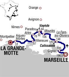 ![]() lundi 6 juillet 2009 ![]() 12h40 (Bouches du Rhône) : Marseille / Rond-point Fontaine des Tuiles (km 0) - L'Estaque (km 0.5) - Le Rove (km 6.5) - Gignac-la-Nerthe (km 11.5) - Le Plan-des-Pennes (km 17.5) - Les Pennes-Mirabeau (km 19.5) - Cabries (km 28.5) - Calas (km 30.5) - La Fare-les-Oliviers (km 48.5-sprint) - Les Guigues (km 51.5) - Côte de Calissanne (km 56-GPM4) - Lançon-Provence (km 59.5) - Grans (km 64.5) - Eyguières (km 76) - Aureille (km 84.5) - Mouries (km 90.5-sprint) - Maussane-les-Alpilles (km 97) - Les Baux-de-Provence (km 101.5) - Col de la Vayède (km 102-GPM4) - Paradou (km 104.5-ravitaillement) - Fontvieille (km 109.5) - Abbaye de Montmajour (km 115) - Arles (km 118.5-sprint) - Villeneuve (km 139) - (Gard) : Sylvéréal (km 169) - Montcalm (km 173.5) - Aigues-Mortes (près) (km 182.5) - Le Grau-du-Roi (près) (km 187) - (Hérault) : entrée La Grande-Motte (km 194.5) - La Grande-Motte / Av. Robert Fages (km 196.5). ![]() ![]() ![]() Météo : chaleur, vent latéral dans le final. 179 partants. - La chaleur tombe sur le Tour comme une chape de plomb et les leaders ne font rien pour empêcher Bouet et Dumoulin de partir dès le premier kilomètre. De Kort et Perez Moreno sentent la bonne affaire et rejoignent le duo français au km.10. Avec un fort vent de face, le peloton roule à moins de 30 km/h dans la première heure et favorise l'envolée des échappés qui vont compter 12'45" d'avance au kilomètre 43 ! - Les Saxo Bank du maillot jaune ne prennent pas la chasse à leur compte et comme la veille c'est l'équipe Columbia qui sonne le réveil à 70 kilomètres de l'arrivée. Quelques équipes les aident à la poursuite notamment Rabobank et Française des Jeux. A 40 km de La Grande Motte, le quatuor de tête ne compte plus que 3 minutes d'avance. Encore une fois, la combativité ne va pas payer. - A 30 km du but, le Team Columbia accélère brutalement et avale quelques kilomètres plus loin les échappés. Mais plusieurs cadors sont surpris par l'étirement du peloton et se font piéger notamment Sastre, Evans, Menchov, Contador et Andy Schleck. Dans le paquet de tête de 27 coureurs sont présents dont Armstrong, Popovych, Zubeldia, T. Martin... et le maillot jaune. A l'arrivée les "piégés" déboursent une quarantaine de secondes ! Cavendish contient Hushovd (2ème) et remporte facilement sa deuxième étape consécutive. Cancellara conserve le maillot jaune. ![]() Étape : ![]() 1. Mark Cavendish (Gbr) en 5h01'24" (moy : 39.117 km/h) 2. Thor Hushovd (Nor) 3. Cyril Lemoine (Fra) 4. Samuel Dumoulin (Fra) 5. Jérôme Pineau (Fra) 6. Fabian Cancellara (Sui) 7. Fabian Wegmann (All) 8. Fumiyuki Beppu (Jap) 9. Maxime Bouet (Fra) 10. Linus Gerdemann (All) 11. Yaroslav Popovych (Ukr) 12. Thierry Hupond (Fra) 13. Ruben Perez (Esp) 14. Stéphane Augé (Fra) 15. Tony Martin (All) 16. Mark Renshaw (Aus) 17. George Hincapie (Usa) 18. Kim Kirchen (Lux) 20. Koen De Kort (Hol) 21. Maxime Monfort (Bel) 22. Christophe Kern (Fra) 23. Simon Geschke (All) 24. Haimar Zubeldia (Esp) 25. Michael Rogers (Aus) 26. Hayden Roulston (Nzl) à 11" 27. Jonathan Hivert (Fra) 28. Romain Feillu (Fra) à 40" 29. Cyril Dessel (Fra) à 41" 30. Kenny-Robert Van Hummel (Hol) 31. José Joaquin Rojas (Esp) 32. Cadel Evans (Aus) 33. Nicki Sørensen (Dan) 34. Lloyd Mondory (Fra) 35. Bradley Wiggins (Gbr) 36. Christian Knees (All) 37. Gerald Ciolek (All) 38. Peter Velits (Svq) 39. Bernhard Eisel (Aut) 40. Luis Pasamontes (Esp) 41. Christian Vandevelde (Usa) 42. Yauheni Hutarovich (Blr) 43. Koldo Fernandez (Esp) 44. Fränk Schleck (Lux) 45. 46. Arnaud Coyot (Fra) 47. Johannes Fröhlinger (All) 48. Filippo Pozzato (Ita) 49. Alberto Contador (Esp) 50. Anthony Geslin (Fra) 51. Nikolai Trussov (Rus) 52. Denis Menchov (Rus) 53. Benoît Vaugrenard (Fra) 54. Andy Schleck (Lux) 55. Stijn Devolder (Bel) 56. Vladimir Karpets (Rus) 57. Sylvain Chavanel (Fra) 58. Yukiya Arashiro (Jap) 59. Jérémy Roy (Fra) 60. Sandy Casar (Fra) 61. Carlos Barredo (Esp) 62. William Bonnet (Fra) 63. Tyler Farrar (Usa) 64. José Ivan Gutierrez (Esp) 65. Angelo Furlan (Ita) 66. Kurt-Asle Arvesen (Nor) 67. Rui Alberto Costa (Por) 68. Aliaksandr Kuschynski (Blr) 69. Alessandro Ballan (Ita) 70. Jens Voigt (All) 71. Tom Boonen (Bel) 72. Steven De Jongh (Hol) 73. Egoi Martinez (Esp) 74. Markus Fothen (All) 75. Nicolas Roche (Irl) 76. Stuart O'Grady (Aus) 77. Alexandre Pichot (Fra) 78. Vincenzo Nibali (Ita) 79. Geoffroy Lequatre (Fra) 80. 81. Rémi Pauriol (Fra) 82. Roman Kreuziger (Tch) 83. Daniele Bennati (Ita) 84. Oscar Freire (Esp) 85. Jürgen Van den Broeck (Bel) 86. Fabio Sabatini (Ita) 87. Brett Lancaster (Aus) 88. Levi Leipheimer (Usa) 89. Leonardo Duque (Col) 90. Brian Vandborg (Dan) 91. Heinrich Haussler (All) 92. Gustav-Erik Larsson (Sue) 93. Andreas Klöden (All) 94. Carlos Sastre (Esp) 95. Andreas Klier (All) 96. Ryder Hesjedal (Can) 97. Matteo Tosatto (Ita) 98. Oscar Pereiro (Esp) 99. Luis Leon Sanchez (Esp) 100. Marzio Bruseghin (Ita) * 101. Sébastien Rosseler (Bel) 102. Rinaldo Nocentini (Ita) 103. Saïd Haddou (Fra) 104. Christophe Le Mével (Fra) 105. Bert Grabsch (All) 106. Stéphane Goubert (Fra) 107. José Luis Arrieta (Esp) 108. Robert Gesink (Hol) 109. Grégory Rast (Sui) 110. Stijn Vandenbergh (Bel) 111. David Millar (Gbr) 112. Pierrick Fedrigo (Fra) 113. Simon Spilak (Slo) 114. Mickaël Delage (Fra) 115. Serguei Ivanov (Rus) 116. David Loosli (Sui) 117. Vladimir Efimkin (Rus) 118. David Le Lay (Fra) 119. Laurent Lefèvre (Fra) 120. Juan Manuel Garate (Esp) 121. Rigoberto Uran (Col) 122. Juan José Oroz (Esp) 123. Piet Rooijakkers (Hol) 124. Hubert Dupont (Fra) 125. Amets Txurruka (Esp) 126. Grischa Niermann (All) 127. Volodymir Gustov (Ukr) 128. Alexandre Botcharov (Rus) 129. Eduardo Gonzalo (Esp) 130. Igor Anton (Esp) 131. Alessandro Vanotti (Ita) 132. Gorka Verdugo (Esp) 133. Juan Antonio Flecha (Esp) 134. Laurens Ten Dam (Hol) 135. Joost Posthuma (Hol) 136. Julian Dean (Nzl) 137. Niki Terpstra (Hol) 138. 