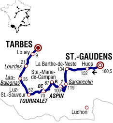 ![]() dimanche 12 juillet 2009 ![]() 12h35 (Haute-Garonne) : D8 Saint-Gaudens (km 0) - Martres de Rivière (km 3) - Pointis de Riviere (km 5.5) - Huos (km 8.5) - Gourdan-Polignan (km 9) - Montrejeau (km 10.5) - Hautes-Pyrénées) : Le Broca (km 15) - Saint-Paul (près) (km 17) - Saint-Laurent de Neste (km 18) - Aneres (km 20.5) - Tuzaguet (km 22.5) - Escala (km 25.5) - La Barthe de Neste (km 26.5) - Izaux (km 30) - Lortet (km 31.5) - Heches (km 34.5) - Rebouc (km 37.5) - Sarrancolin (km 41.5-sprint) - Beyrede-Jumet (km 42) - Camous (près) (km 44) - Arreau (km 48) - Col d'Aspin (km 60.5-GPM1) - Payolle (km 66) - La Séoube (km 69.5) - Sainte-Marie-de-Campan (km 73.5-ravitaillement) - Cabadur (km 76) - Gripp (km 77) - La Mongie (km 85.5) - Col du Tourmalet (km 90-GPM HC) - Barèges (km 100.5) - Esterre (km 107.5) - Luz-Saint-Sauveur (km 108) - Esquieze-Sere (km 108.5) - Soulom (km 119.5) - Pierrefitte-Nestalas (km 120.5) - Adast (près) (km 122) - Lau-Balagnas (km 125.5-sprint) - Argeles-Gazost (km 125.5) - Ayzac-Ost (km 128) - Agos-Vidalos (km 130) - Lourdes (km 139-sprint) - Ade (km 143.5) - Louey (km 151) - Juillan (km 152) - Odos (km 154.5) - entrée Tarbes (km 156) - Tarbes / Av. Pierre De Coubertin (km 160.5). ![]() ![]() ![]() Météo : beau temps ensoleillé, 30°, vent variable. 172 partants - Treize coureurs se dégagent au km 13 qui sont : Fédrigo, Augé, Riblon, Vaugrenard, Pellizotti, Voigt, Haussler, Devolder, Duque, Fothen, Righi, Pate & Gechke. Les Astana et Euskatel ne laissent pas faire et l'écart ne dépasse pas la quinzaine de secondes. Armstrong est le premier à opérer la jonction au km 24 mais aussitôt, Fédrigo, Pellizotti, Duque et Voigt relancent le coup. L'équipe Euskatel repart en chasse mais cette fois-ci les échappés creusent l'écart et ils atteignent le pied du col d'Aspin avec 3'40" d'avance. Dans l'ascension, Duque est décroché du groupe de tête. Pellizotti, Fédrigo & Voigt passent dans cet ordre le col avec 3'30" sur le peloton "maillot jaune". - Après la descente (km 73.5), le trio de tête se ravitaille et attaque l'ascension du mythique Tourmalet avec 2'35" sur Duque et 4'10" sur le peloton. Bouet se lance en contre attaque mais il est rapidement débordé par 8 coureurs : Moncoutié, Voeckler, Van den Broeck, Garate, Paulhino, Txurruka & Martinez. Ten Dam qui en faisait partie sera distancé sur chute dans la descente. Entre-temps, Voigt est lâché par Fédrigo et Pellizotti. Au sommet (km 90), Pelizzotti passe devant Fédrigo, à 2'40" le groupe de contre-attaque, à 5'10" un groupe maillot jaune très compact. - Au km 118, le peloton reprend les intercalés alors que les deux échappés courent toujours à 3'40" devant la meute. Les équipes Rabobank et Caisse d'Épargne embrayent et l'écart se réduit peu à peu : 2'30" aux 25 kilomètres, 1'15" aux 10 km, 40" à 3000 mètres de la ligne. C'est trop tard, Fédrigo et Pellizotti se jouent la victoire. L'Italien démarre le premier, dans le dernier virage, mais le Français en grande forme le déborde assez facilement. Freire règle le peloton à 34". Rinaldo Nocentini conserve sont maillot jaune. ![]() Étape : ![]() 1. Pierrick Fedrigo (Fra) en 4h05'31" (moy : 39.223 km/h) 2. 3. Oscar Freire (Esp) à 34" 4. Serguei Ivanov (Rus) 5. Peter Velits (Svq) 6. José Joaquin Rojas (Esp) 7. Greg Van Avermaet (Bel) 8. Geoffroy Lequatre (Fra) 9. Alessandro Ballan (Ita) 10. Nicolas Roche (Irl) 11. Jérémy Roy (Fra) 12. Christophe Le Mével (Fra) 13. Sylvain Chavanel (Fra) 14. Sébastien Minard (Fra) 15. Brice Feillu (Fra) 16. George Hincapie (Usa) 17. Andreas Klöden (All) 18. Pierre Rolland (Fra) 19. Vincenzo Nibali (Ita) 20. 21. Maxime Monfort (Bel) 22. Tony Martin (All) 23. Alberto Contador (Esp) 24. Rinaldo Nocentini (Ita) 25. Christian Knees (All) 26. Denis Menchov (Rus) 27. Thomas Voeckler (Fra) 28. Cadel Evans (Aus) 29. Linus Gerdemann (All) 30. Christian Vandevelde (Usa) 31. Hayden Roulston (Nzl) 32. Ryder Hesjedal (Can) 33. Jens Voigt (All) 34. Andy Schleck (Lux) 35. Vladimir Efimkin (Rus) 36. Fränk Schleck (Lux) 37. Vladimir Karpets (Rus) 38. Alexandre Botcharov (Rus) 39. Levi Leipheimer (Usa) 40. Luis Leon Sanchez (Esp) 41. Bradley Wiggins (Gbr) 42. Carlos Sastre (Esp) 44. Haimar Zubeldia (Esp) 45. Michael Rogers (Aus) 46. Yaroslav Popovych (Ukr) 47. Kim Kirchen (Lux) 48. Roman Kreuziger (Tch) 49. Jürgen Van den Broeck (Bel) 50. Nicki Sørensen (Dan) 51. Rigoberto Uran (Col) 52. Bingen Fernandez (Esp) 53. Sandy Casar (Fra) 54. José Angel Gomez Marchante (Esp) 55. Chris-Anker Sørensen (Dan) 56. Volodymir Gustov (Ukr) 57. Frederik Willems (Bel) 58. Amets Txurruka (Esp) 59. Maxime Bouet (Fra) 60. Egoi Martinez (Esp) 61. Stéphane Goubert (Fra) 62. Gustav-Erik Larsson (Sue) 63. Carlos Barredo (Esp) 64. Matthew Lloyd (Aus) 65. David Moncoutié (Fra) 66. Laurent Lefèvre (Fra) 67. David Millar (Gbr) 68. Sergio Miguel Paulinho (Por) 69. Hubert Dupont (Fra) 70. Luis Pasamontes (Esp) 71. Yury Trofimov (Rus) 72. Juan Manuel Garate (Esp) 73. Nicolas Vogondy (Fra) 74. José Ivan Gutierrez (Esp) 75. David Arroyo (Esp) 76. Amaël Moinard (Fra) 77. Laurens Ten Dam (Hol) 78. Grischa Niermann (All) à 1'19" 79. Rui Alberto Costa (Por) à 1'32" 80. Charles Wegelius (Gbr) à 2'08" 81. Martijn Maaskant (Hol) à 15'15" 82. Johan Van Summeren (Bel) 83. Mauro Santambrogio (Ita) 84. Joan Horrach (Esp) 85. Juan José Oroz (Esp) 86. Christophe Kern (Fra) à 18'48" 87. Alessandro Vanotti (Ita) 88. Sebastian Lang (All) 89. Joost Posthuma (Hol) 90. Christophe Moreau (Fra) 91. Arnaud Coyot (Fra) 92. Marcin Sapa (Pol) 93. Jonathan Hivert (Fra) 94. Stef Clement (Hol) 95. Filippo Pozzato (Ita) 96. Brian Vandborg (Dan) 97. Kurt-Asle Arvesen (Nor) 98. Staf Scheirlinckx (Bel) 99. Fabian Cancellara (Sui) 100. Aliaksandr Kuschynski (Blr) 101. Grégory Rast (Sui) 102. Nikolai Trussov (Rus) 103. Gorka Verdugo (Esp) 104. Thierry Hupond (Fra) 105. José Luis Arrieta (Esp) 106. Christophe Riblon (Fra) 107. Ruben Perez (Esp
