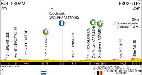 ![]() dimanche 4 juillet 2010 ![]() (PAYS-BAS) - (Zuid Holland) : Rotterdam (km 0) - Rhoon N492 (km 3.5) - Poortugaal (km 5) - Hoogvliet (km 8) - Spijkenisse (km 11) - Abbenbroek (près de) N218 (km 17.5) - Hellevoetsluis N494 (km 24) - Hellevoetsluis (km 25.5) - Haringvlietdam N57 (km 33.5) - Stellendam (km 37.5) - Goedereede (km 40.5) - Ouddorp (km 43.5) - Brouwersdam (km 47.5) - Port Zelande (km 52) - Haamstede (km 67) - Burgh (km 68) - Stormvloedkering-Oosterschelde (km 69) - Zeeland Neeltje Jans N57 (km 73-sprint) - De Roompot (km 76.5) - Kamperland (près de) N 255 (km 82.5) - Roodewijk N256 (km 97.5-ravitaillement) - Goes (km 100.5) - Kapelle N289 (km 107) - Kruiningen (km 115) - Krabbendijke (km 120) - Rilland (km 125) - Hoogerheide (km 139) - Putte (km 147-sprint) - (BELGIQUE) (Anvers) : Putte N11 (km 149.5) - Kapellen (km 153) - Ekeren (km 158.5-sprint) - Merksem (km 159.5) - Anvers N1 (km 163) - Edegem N173 (km 178) - Kontich (km 181.5) - Waarloos N1 (km 185) - Rumst (km 186.5) - Walem (km 189) - Malines (km 190.5) - Hombeek N 227 (km 197.5) - Leest (km 202.5) - Kapelle-den-Bos (km 203.5) - Nieuwenroder (km 207.5) - Meise (km 209.5) - (Vlaams Brabant) : Meise N211B (km 213.5) - Strombeek-Bever N277 (km 215.5) - (Bruxelles-Capitale) : Bruxelles (km 223.5). ![]() ![]() ![]() Youtube" (résumé étape 1) ![]() Étape : ![]() 1. Alessandro Petacchi (Ita) en 5h09'38" (moy : 43.309 km/h) 2. Mark Renshaw (Aus) 3. Thor Hushovd (Nor) 4. Robbie McEwen (Aus) 5. Mathieu Ladagnous (Fra) 6. Daniel Oss (Ita) 7. José Joaquin Rojas (Esp) 8. Christian Knees (All) 9. Ruben Perez (Esp) 10. Jürgen Roelandts (Bel) 11. Sébastien Turgot (Fra) 12. Linus Gerdemann (All) 13. Julien El Farès (Fra) 14. Luke Roberts (Aus) 15. Geraint Thomas (Gbr) 16. Kanstantsin Siutsou (Blr) 17. Sylvain Chavanel (Fra) 18. Edvald Boasson Hagen (Nor) 19. Carlos Barredo (Esp) 20. Michael Barry (Can) 21. Samuel Dumoulin (Fra) 22. Sébastien Minard (Fra) 23. Kevin De Weert (Bel) 24. Johannes Fröhlinger (All) 25. Eduard Vorganov (Rus) 26. Brett Lancaster (Aus) 27. Jakob Fuglsang (Dan) 28. Cadel Evans (Aus) 29. Stéphane Augé (Fra) 30. Martin Elmiger (Sui) 31. Juan Antonio Flecha (Esp) 32. Danilo Hondo (All) 33. Christophe Le Mével (Fra) 34. Jérôme Pineau (Fra) 35. Yukiya Arashiro (Jap) 36. Alexandr Kolobnev (Rus) 37. Mickaël Delage (Fra) 38. Alessandro Ballan (Ita) 39. Bernhard Eisel (Aut) 40. Robert Hunter (Afs) 41. Julian Dean (Nzl) 42. Christophe Kern (Fra) 43. Kevin Seeldraeyers (Bel) 44. Mauro Da Dalto (Ita) 45. Andriy Grivko (Ukr) 46. Alexandre Vinokourov (Kaz) 47. Thomas Lövkvist (Sue) 49. Roger Kluge (All) 50. Jürgen Van den Broeck (Bel) 51. Maxime Monfort (Bel) 52. Roman Kreuziger (Tch) 53. Kristjan Koren (Slo) 54. Simon Spilak (Slo) 56. George Hincapie (Usa) 57. Yaroslav Popovych (Ukr) 58. Vasil Kiryienka (Blr) 59. Grega Bole (Slo) 60. Bert Grabsch (All) 61. Luis Leon Sanchez (Esp) 62. David Millar (Gbr) 63. Francesco Gavazzi (Ita) 64. Francis De Greef (Bel) 65. Sebastian Lang (All) 66. Aliaksandr Kuschynski (Blr) 67. Stijn Vandenbergh (Bel) 68. Grischa Niermann (All) 69. Pierre Rolland (Fra) 70. Robert Gesink (Hol) 71. Wesley Sulzberger (Aus) 72. Daniel Lloyd (Gbr) 73. Benjamin Noval (Esp) 74. Iñaki Isasi (Esp) 75. José Ivan Gutierrez (Esp) 76. Samuel Sanchez (Esp) 77. Daniel Moreno (Esp) 78. Sandy Casar (Fra) 79. Simon Gerrans (Aus) 80. Brent Bookwalter (Usa) 81. Bradley Wiggins (Gbr) 82. Serge Pauwels (Bel) 83. Rinaldo Nocentini (Ita) 84. Christophe Riblon (Fra) 85. Fabio Felline (Ita) 86. Thomas Rohregger (Aut) 87. Christophe Moreau (Fra) 88. Ruben Plaza (Esp) 89. Rui Alberto Costa (Por) 90. Vladimir Karpets (Rus) 91. Ivan Basso (Ita) 92. Manuel Quinziato (Ita) 93. Rein Taaramäe (Est) 94. Cyril Gautier (Fra) 95. Damien Monier (Fra) 96. Matthieu Sprick (Fra) 97. Anthony Geslin (Fra) 98. Pierrick Fedrigo (Fra) 99. Volodymir Gustov (Ukr) 100. Anthony Charteau (Fra) 101. Nicki Sørensen (Dan) 102. Iban Velasco (Esp) 103. John Gadret (Fra) 104. Maxim Iglinskiy (Kaz) 105. Benoît Vaugrenard (Fra) 106. Mario Aerts (Bel) 107. Adriano Malori (Ita) 108. Denis Menchov (Rus) 109. José Alberto Benitez (Esp) 110. Koos Moerenhout (Hol) 111. Johan Vansummeren (Bel) 112. Juan Manuel Garate (Esp) 113. Mauro Santambrogio (Ita) 114. Stuart O'Grady (Aus) 115. Arkaitz Duran (Esp) 116. Sylwester Szmyd (Pol) 117. Andy Schleck (Lux) 118. Matti Breschel (Dan) 119. Frank Schleck (Lux) 120. Damiano Cunego (Ita) 121. Ryder Hesjedal (Can) 122. Gorka Verdugo (Esp) 123. David Lelay (Fra) 124. Jérémy Roy (Fra) 125. Eros Capecchi (Ita) 126. David De La Fuente (Esp) 127. Amaël Moinard (Fra) 128. Brian Vandborg (Dan) 129. Jens Voigt (All) 130. Fabian Cancellara (Sui) 131. Chris Anker Sørensen (Dan) 132. Christopher Horner (Usa) 133. Levi Leipheimer (Usa) 134. Karsten Kroon (Hol) 135. Bram Tankink (Hol) 136. Steven Cummings (Gbr) 137. Mathieu Perget (Fra) 138. Imanol Erviti (Esp) 139. Markus Eibegger (Aut) 140. Tyler Farrar (Usa) 141. Martijn Maaskant (Hol) 142. Paolo Tiralongo (Ita) 143. Aitor Perez (Esp) 144. Iban Mayoz (Esp) 145. Rafael Valls (Esp) 146. Francesco Bellotti (Ita) 147. Christian Vandevelde (Usa) 148. Matthew Lloyd (Aus) 149. Charles Wegelius (Gbr) 150. Grégory Rast (Sui) 151. Marcus Burghardt (All) 152. Nicolas Roche (Irl) 153. Nicolas Vogondy (Fra) 154. Rémi Pauriol (Fra) 155. Daniel Navarro (Esp) 156. Jesus Hernandez (Esp) 157. Alexandr Pliuschin (Mol) 158. Carlos Sastre (Esp) 159. Maarten Tjallingii (Hol) à 2'37" 160. Maxime Bouet (Fra) 161. Thomas Voeckler (Fra) 162. Dries Devenyns (Bel) 163. Andreas Klöden (All) 164. Sergio Miguel Paulinho (Por) 165. Dimitri Champion (Fra) 166. Steve Morabito (Sui) 167. Niki Terpstra (Hol) 168. Anthony Roux (Fra) 169. Ignatas Konovalovas (Lit) 170. David Zabriskie (Usa) 171. Serguei Ivanov (Rus) 172. Pavel Brutt (Rus) 173. Joaquin Rodriguez (Esp) 174. Jürgen Van de Walle (Bel) 175. Francesco Reda (Ita) 176. Mirco Lorenzetto (Ita) 177. Oscar Freire (Esp) 178. Mark Cavendi