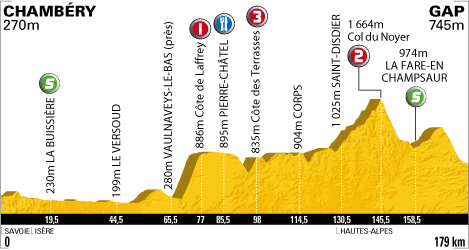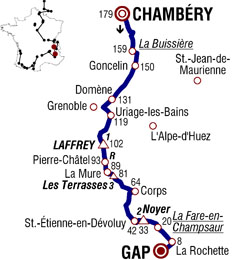 ![]() mercredi 14 juillet 2010 ![]() (Savoie) : Chambery D201 (km 0) - Saint-Baldolph (km 1.5) - Apremont (km 3.5) - Saint-André D12 (km 7) - Les Abymes (près de) (km 9) - (Isère) : Chapareillan (près de) D1090 (km 12.5) - Lagache (km 17) - Pontcharra (près de) (km 17) - La Buissière (km 19.5-sprint) - Le Cheylas (km 25.5) - Goncelin (km 28.5) - Tencin (km 32.5) - Le Champ (km 37) - Froges (km 38) - Brignoud (km 40) - Villard-Bonnot (km 41) - Lancey (km 43) - Le Versoud (km 44.5) - Pruney (km 44.5) - Domene (km 47.5) - Murianette (km 50.5) - Gières (km 51.5) - Le Sonnant-d'Uriage D524 (km 57.5) - Uriage-les-Bains (km 59.5) - Vaulnaveys-Le-Haut (km 61.5) - Vaulnaveys-Le-Bas (près de) (km 65.5) - Vizille (km 68.5) - Notre-Dame-de-Mesage N85 (km 70) - Laffrey (km 76.5) - Côte de Laffrey (km 77-GPM1) - Montagne Napoléon (km 77.5) - Petichet (km 79.5) - Pierre-Châtel (km 85.5-ravitaillement) - La Mure (km 89) - Le Crozet (km 93) - Charlaix (km 95.5) - Les Terrasses (km 97) - Côte des Terrasses (km 98-GPM3) - Les Egats (km 99) - La Salle-en-Beaumont (km 101.5) - Quet-en-Beaumont (km 106) - Corps (km 114.5) - Le Sautet D537 (km 118) - La Posterle (km 124) - (Hautes-Alpes) : Saint-Disdier D937 (km 130.5) - Giers-le-Courtil D117 (km 135) - Saint-Etienne-en-Devoluy D17 (km 137) - Le Pré (km 138) - Truziaud (km 140.5) - Col du Noyer (km 145.5-GPM2) - Le Noyer (km 152) - La Ville (km 152) - Poligny (km 155.5) - La Fare-En-Champsaur N 85 (km 158.5) - Brutinel (km 160.5) - Le Cros D14 (km 162.5) - Saint-Laurent-du-Cros (km 163.5) - La Rochette D14 (km 170.5) - Les Férauds (km 170.5) - Pont-Sarrazin D314 (km 175.5) - entrée Gap N94 (km 177.5) - Gap (km 179). ![]() ![]() ![]() "Youtube" (résumé) ![]() Étape : ![]() 1. Sergio Miguel Paulinho (Por) en 5h10'56" (moy :34.541 km/h) 2. Vasil Kiryienka (Blr) 3. Dries Devenyns (Bel) à 1'29" 4. Pierre Rolland (Fra) 5. Mario Aerts (Bel) à 1'33" 6. Maxime Bouet (Fra) à 3'20" 7. Nicolas Roche (Irl) à 12'58" 8. Rémi Pauriol (Fra) à 13'57" 9. Mark Cavendish (Gbr) à 14'19" 10. Alessandro Petacchi (Ita) 11. Thor Hushovd (Nor) 12. Robbie McEwen (Aus) 13. Lloyd Mondory (Fra) 14. Sébastien Turgot (Fra) 15. José Joaquin Rojas (Esp) 16. Sebastian Lang (All) 17. Jürgen Roelandts (Bel) 18. Kristjan Koren (Slo) 19. Damien Monier (Fra) 20. Matti Breschel (Dan) 21. Andy Schleck (Lux) 22. Roman Kreuziger (Tch) 23. Levi Leipheimer (Usa) 24. Luke Roberts (Aus) 26. Maarten Tjallingii (Hol) 27. Danilo Hondo (All) 28. Robert Gesink (Hol) 29. Juan Manuel Garate (Esp) 30. Jürgen Van den Broeck (Bel) 31. Kevin De Weert (Bel) 32. Aitor Perez (Esp) 33. David De La Fuente (Esp) 34. Ivan Basso (Ita) 35. Ruben Plaza (Esp) 36. Alan Perez (Esp) 37. Janez Brajkovic (Slo) 38. Alexandr Pliuschin (Mol) 39. Francesco Gavazzi (Ita) 40. Samuel Dumoulin (Fra) 41. Grégory Rast (Sui) 42. Daniel Lloyd (Gbr) 43. Samuel Sanchez (Esp) 44. Cadel Evans (Aus) 45. Iñaki Isasi(Esp) 46. Denis Menchov (Rus) 47. Jeremy Hunt (Gbr) 48. Egoi Martinez (Esp) 49. Francesco Bellotti (Ita) 50. Jens Voigt (All) 51. Michael Barry (Can) 52. Ryder Hesjedal (Can) 53. Martin Elmiger (Sui) 54. Joaquin Rodriguez (Esp) 55. Sébastien Minard (Fra) 56. Julien El Farès (Fra) 57. Damiano Cunego (Ita) 58. Bram Tankink (Hol) 59. Benjamin Noval (Esp) 60. Eduard Vorganov (Rus) 61. Geraint Thomas (Gbr) 62. Kanstantsin Siutsou (Blr) 63. Thomas Lövkvist (Sue) 64. Andreas Klier (All) 65. Matthew Lloyd (Aus) 66. Yaroslav Popovych (Ukr) 67. Iban Velasco (Esp) 68. Johan Vansummeren (Bel) 69. Ruben Perez (Esp) 70. Bradley Wiggins (Gbr) 71. Mauro Da Dalto (Ita) 72. Carlos Sastre (Esp) 73. Alexandre Vinokourov (Kaz) 74. Daniel Moreno (Esp) 75. Michael Rogers (Aus) 76. Christophe Moreau (Fra) 77. Wesley Sulzberger (Aus) 78. George Hincapie (Usa) 79. Bernhard Eisel (Aut) 80. Christophe Le Mével (Fra) 81. Sandy Casar (Fra) 82. Koos Moerenhout (Hol) 83. Juan Antonio Flecha (Esp) 84. Andreas Klöden (All) 85. Thomas Rohregger (Aut) 86. Adriano Malori (Ita) 87. Christophe Riblon (Fra) 88. Gorka Verdugo (Esp) 89. Grega Bole (Slo) 90. Thomas Voeckler (Fra) 91. Matthieu Ladagnous (Fra) 92. Bert Grabsch (All) 93. Luis Leon Sanchez (Esp) 94. Sylvain Chavanel (Fra) 95. Simon Spilak (Slo) 96. Imanol Erviti (Esp) 97. José Ivan Gutierrez (Esp) 98. Mathieu Perget (Fra) 99. Daniel Oss (Ita) 100. Alexandr Kolobnev (Rus) 101. Grischa Niermann (All) 102. Maarten Wynants (Bel) 103. Jürgen Van de Walle (Bel) 104. Christian Knees (All) 105. Tony Martin (All) 106. Oscar Freire (Esp) 107. Andriy Grivko (Ukr) 108. Sylwester Szmyd (Pol) 109. Christopher Horner (Usa) 110. Iban Mayoz (Esp) 111. Yukiya Arashiro (Jap) 112. Anthony Geslin (Fra) 113. John Gadret (Fra) 114. Stéphane Augé (Fra) 115. Eros Capecchi (Ita) 116. Amaël Moinard (Fra) 117. Serguei Ivanov (Rus) 118. Gerald Ciolek (All) 119. Manuel Quinziato (Ita) 120. Stuart O'Grady (Aus) 121. Fabian Wegmann (All) à 15'47 122. Johannes Fröhlinger (All) 123. Anthony Charteau (Fra) 124. Cyril Gautier (Fra) 125. Aliaksandr Kuschynski (Blr) 126. Rémy Di Gregorio (Fra) 127. Mirco Lorenzetto (Ita) 128. Jakob Fuglsang (Dan) 129. Lars Boom (Hol) 131. José Alberto Benitez (Esp) 132. Dmitriy Muravyev (Kaz) 133. Rui Alberto Costa (Por) 134. Nicolas Vogondy (Fra) 135. Nicki Sørensen (Dan) 136. Mauro Santambrogio (Ita) 137. Rafael Valls (Esp) 138. Rein Taaramäe (Est) 139. Steve Morabito (Sui) 140. Volodymir Gustov (Ukr) 141. Maxime Monfort (Bel) 142. Robert Hunter (Afs) 143. Mark Renshaw (Aus) 144. Serge Pauwels (Bel) 145. Matthieu Sprick (Fra) 146. Tyler Farrar (Usa) 147. Brett Lancaster (Aus) 148. Pierrick Fedrigo (Fra) 149. Carlos Barredo (Esp) 150. Dimitri Champion (Fra) 151. Francesco Reda (Ita) 152. Edvald Boasson Hagen (Nor) 153. Julian Dean (Nzl) 154. Maxim Iglinskiy (Kaz) 155. Pavel Brutt (Rus) 156. Martijn Maaskant (Hol) 157. Daniel Navarro (Esp) 158. Jesus Hernandez (Esp) 159. Chris Anker Sørensen (Dan) 160. Arkaitz Duran (Esp) 161. Brian Vandborg (Dan) 162. Francis De Greef (Bel) 16